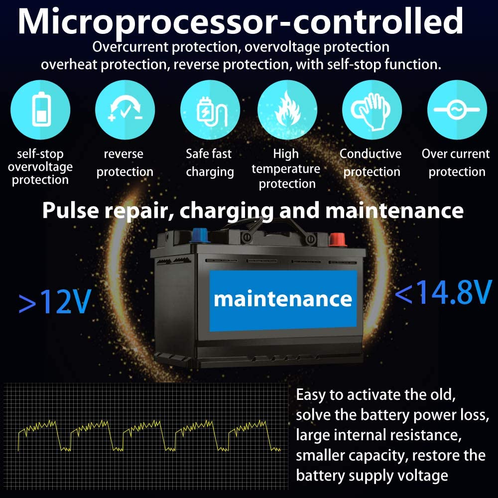 √ Restore your Battery, Don't let dead batteries affect your travel: Built-in smart Auto battery MAINTAINING mode to help to recover old/idle batteries and extend battery life. Please use repair mode if the car battery charger cannot charge the battery. The high-frequency and low-frequency pulse technology has good repair and activation effects. Note: It can not activate a dead battery or repair a damaged battery. LITHIUM BATTERIES ARE NOT ALLOWED