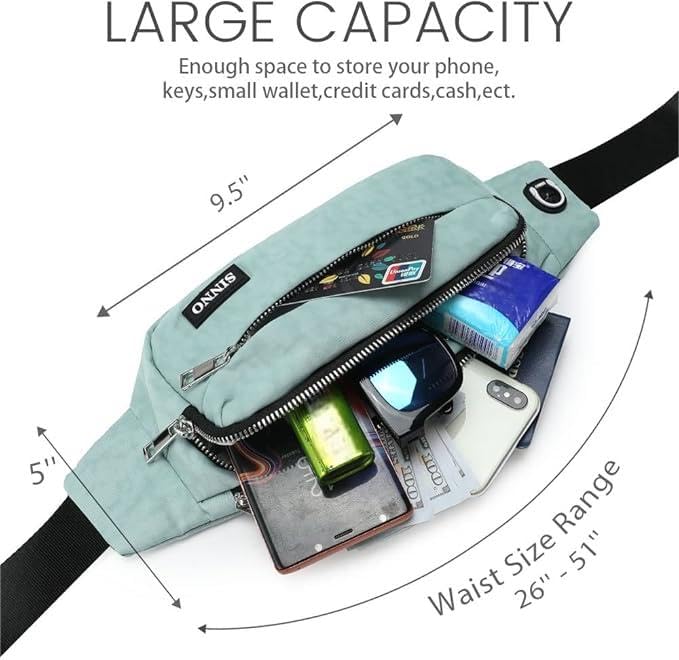 【Changeable Style Fanny Pack,Many Ways to Wear】Since the comfortable long strap is widely adjustable for most waist size(26” - 51”).There are many ways to wear this fanny pack - You can wear it in front of your waist, back on your hip, slant across your chest or over your shoulder.Perfect for various occasions.