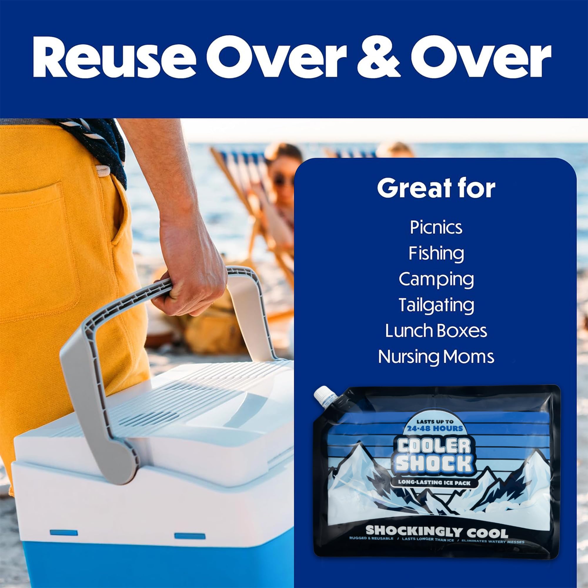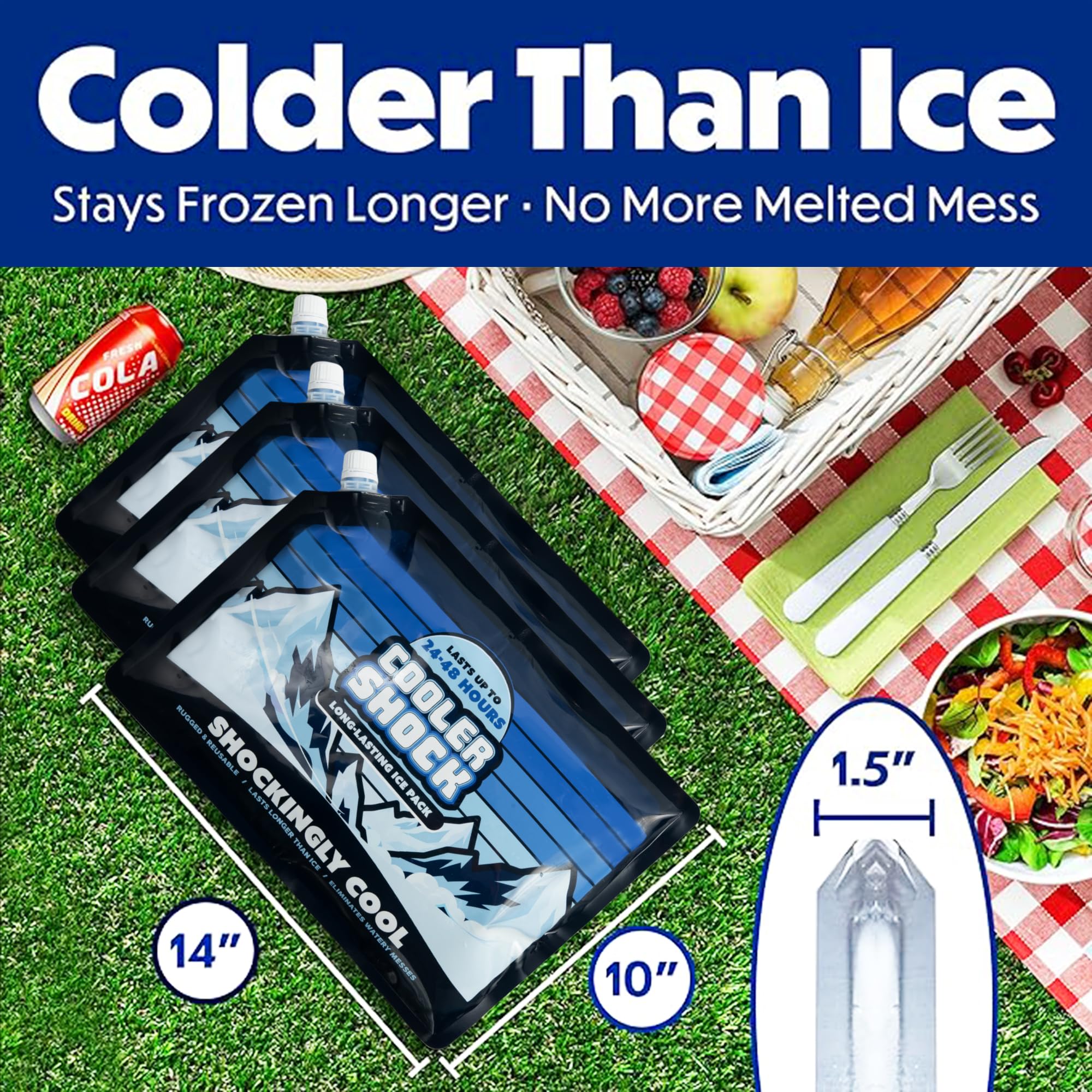 BIG & STRONG - Nylon-reinforced for durability, each of these 10"x14"x1.5" large cooler ice packs can replace 5 to 6lbs of traditional ice, leaving more room for food and drinks. Our largest size is designed for use with XL insulated beach cooler totes and large camping coolers. We suggest measuring inside your cooler first!