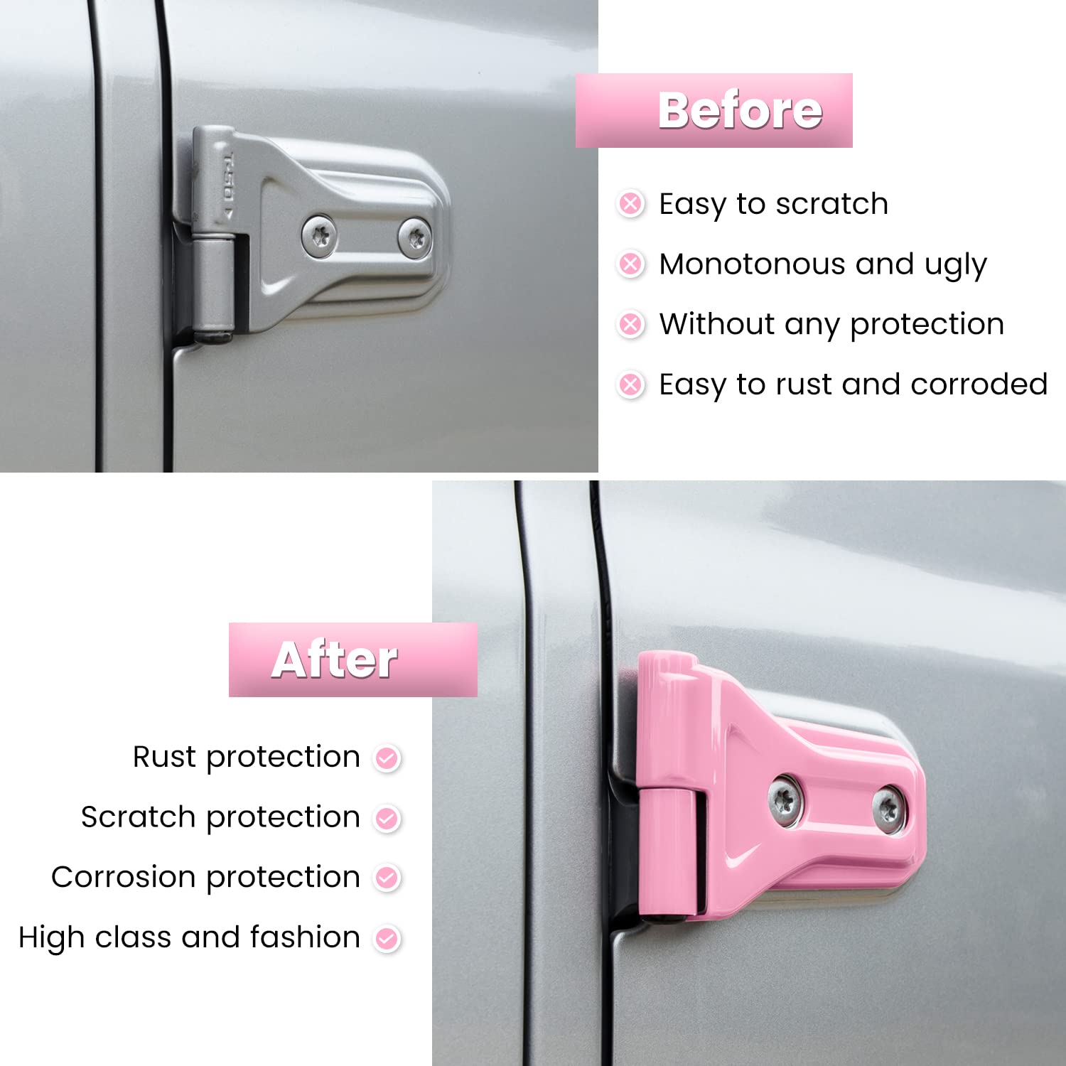Perfect Design — Provides a high class, unique and fashion decor style to enhance the visual appearance of your car. It can cover existing scratches and prevent your door hinges from fingernails, key scratches and etc. Dress up your door hinges to protect from rust and corrosion.