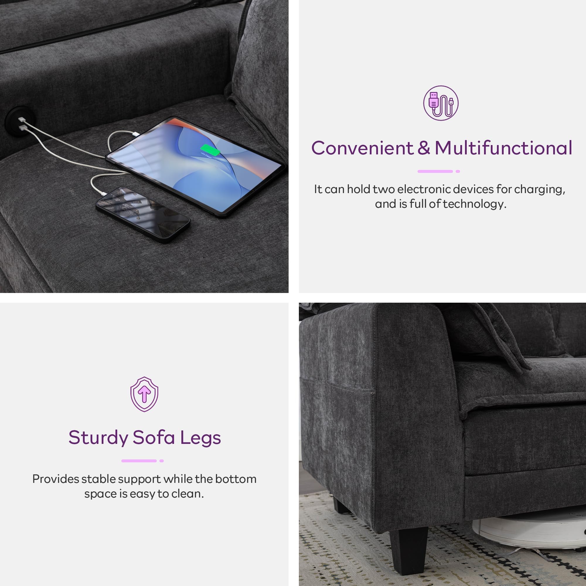 【Practical Multifunctional Design】 The large 3 seat couches features removable armrest cushions, equipped with USB and Type-C ports on the armrest, allowing a long-lasting journey for two electronic devices at once. The storage pockets on both side make love seat easy to keep the areas around the grey sofa tidy. Store things you want easily accessible yet still hidden.