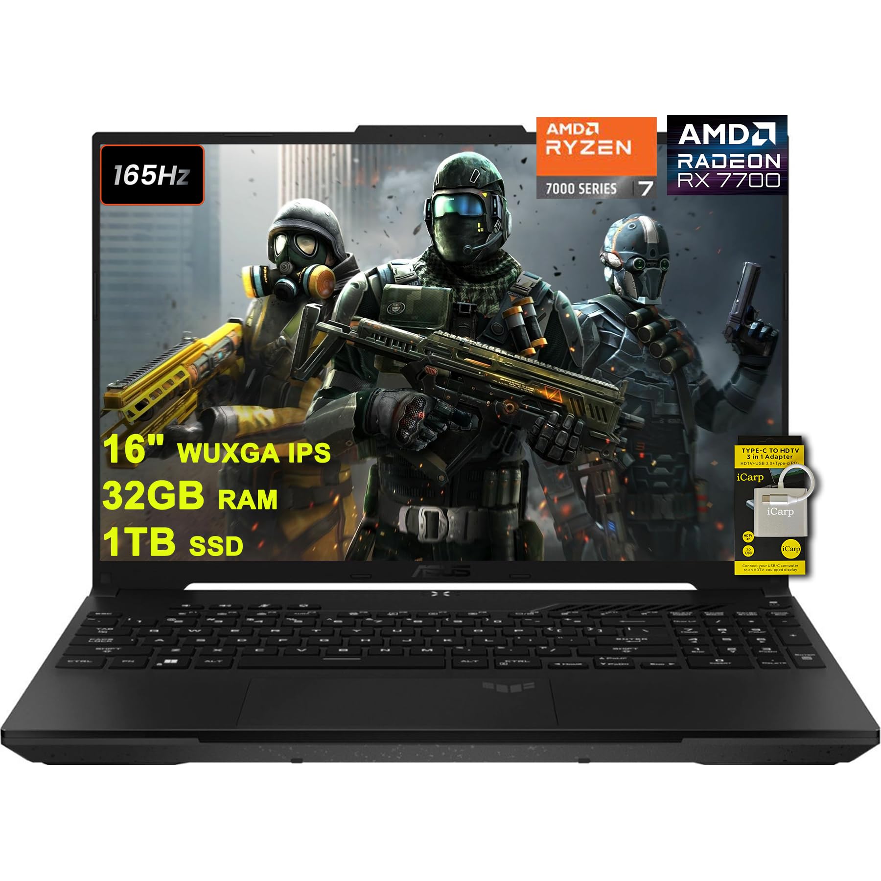 The ASUS TUF Gaming A16 laptop features a 16" WUXGA 1920 x 1200 Anti-glare 165Hz display with a 7ms FreeSync Premium MUX Switch. The dedicated AMD Radeon RX 7700S Graphic ensures smooth visuals and an immersive gaming experience. Powered by an AMD Ryzen 7 7735HS Processor, the laptop delivers high-performance computing for gaming and multitasking With 32GB of RAM, you can expect seamless multitasking and smooth gameplay. The laptop is equipped with a 1TB SSD, providing ample storage space for your games, files, and multimedia content. It comes pre-installed with Windows 11 Home, offering a user-friendly interface and access to a wide range of applications. The backlit keyboard allows you to game or work in low-light conditions. Experience immersive audio with Dolby Atmos technology. The laptop also features AI Noise Cancelation, which helps reduce background noise during video calls or recordings. Additionally, it has received Hi-Res Certification, ensuring high-quality audio output.