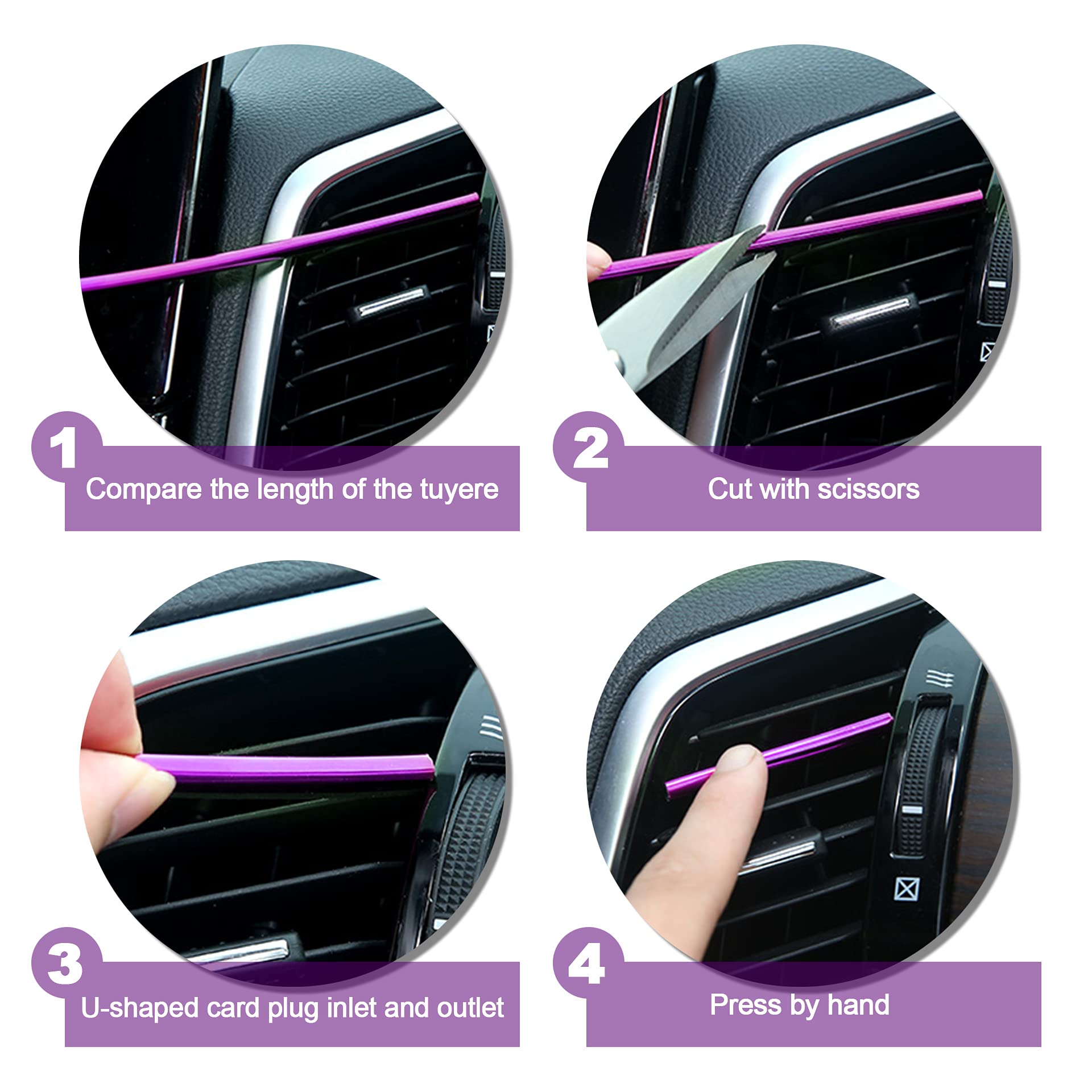 Easy to Use - Firstly measure the length of each grid of the air outlet and cut out the corresponding length then simply snap in the grid of the air outlet. Car trim interior strip has a U-shaped clip design, which can easily clamp the vent grille without falling.