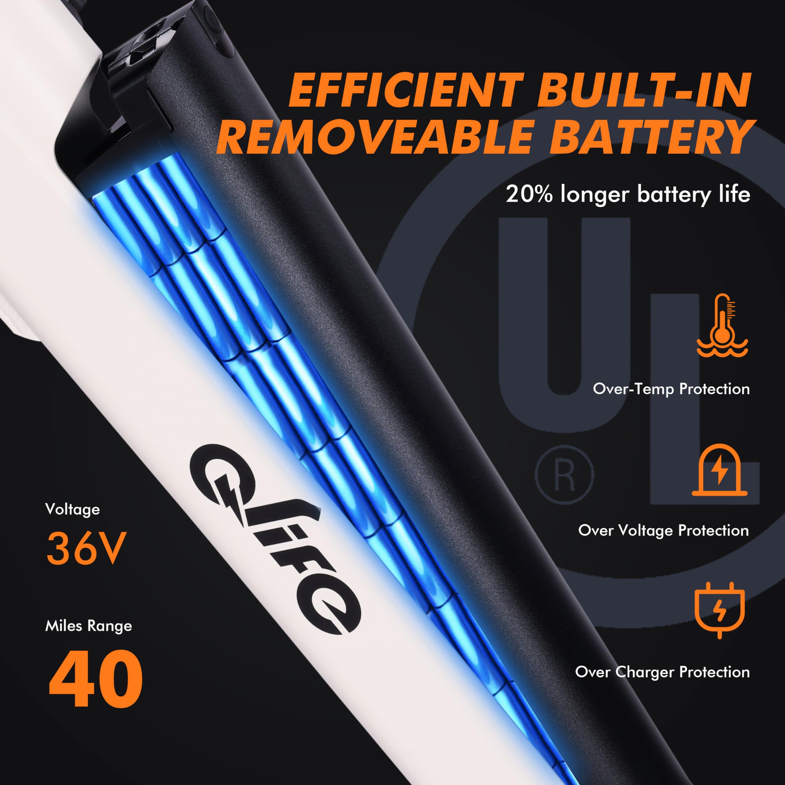 Built-in Removeble Battery:The electric bike built-in battery in this e-bike is UL2849 certified for anti-theft, while over-temperature, over-voltage, and over-charging protections ensure reliable performance and long battery life(40 Miles Range | 36V). Its battery life is significantly extended by 20% compared to ordinary batteries.