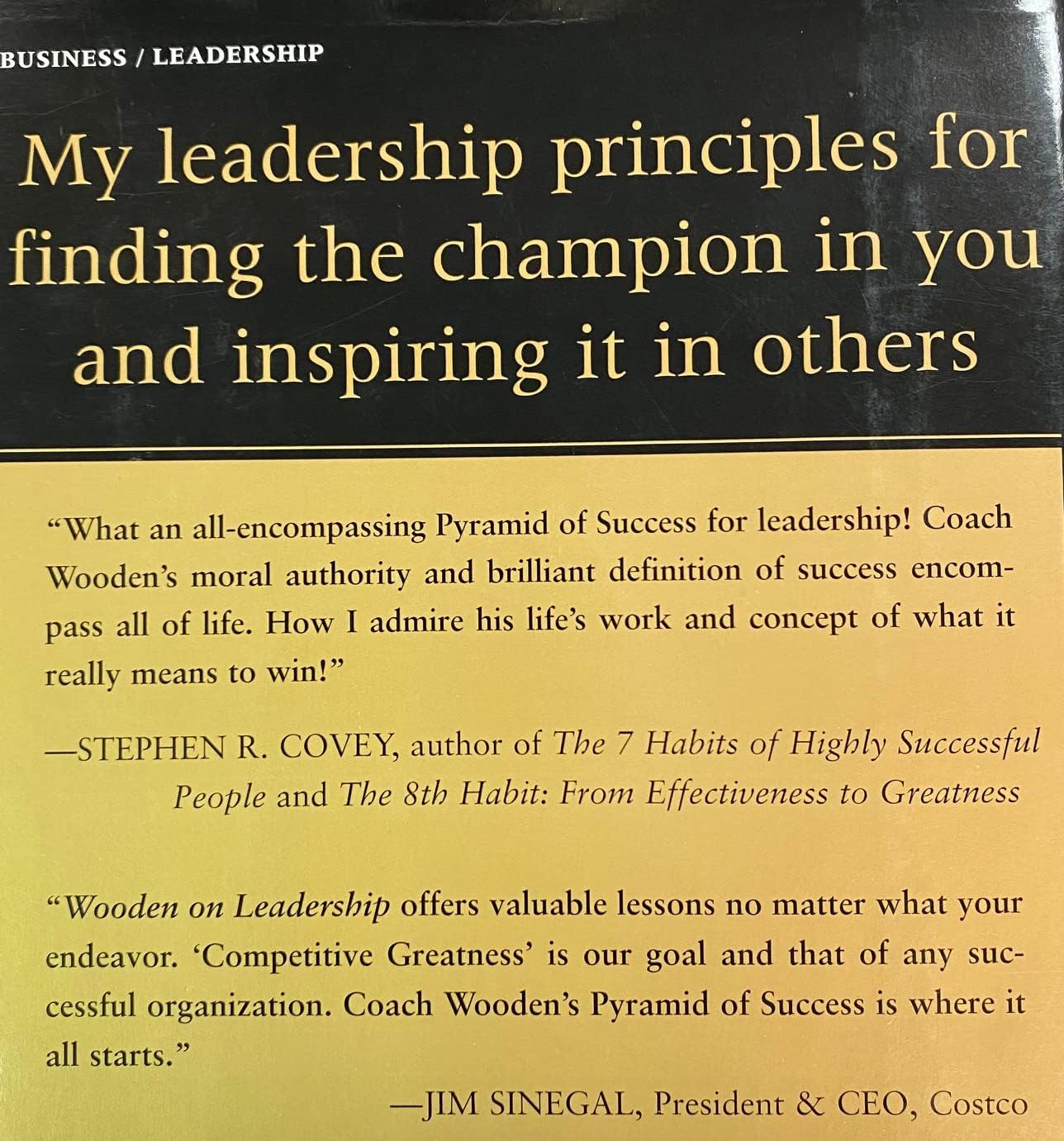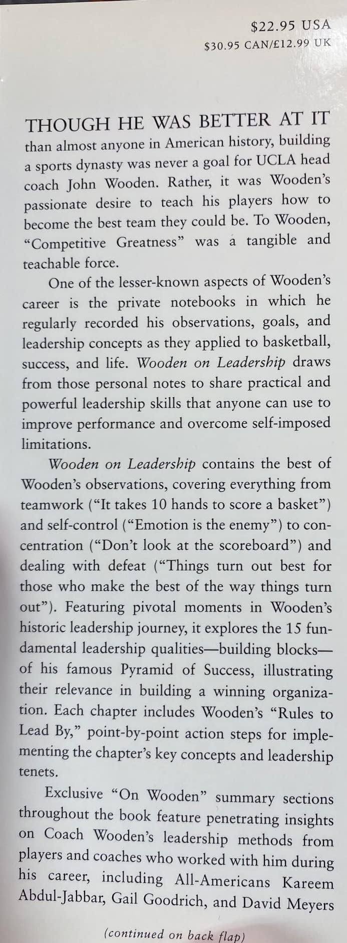 A Wall Street Journal Bestseller A compelling look inside the mind and powerful leadership methods of America’s coaching legend, John Wooden "Team spirit, loyalty, enthusiasm, determination. . . . Acquire and keep these traits and success should follow." --Coach John Wooden John Wooden’s goal in 41 years of coaching never changed; namely, to get maximum effort and peak performance from each of his players in the manner that best served the team. Wooden on Leadership explains step-by-step how he pursued and accomplished this goal. Focusing on Wooden’s 12 Lessons in Leadership and his acclaimed Pyramid of Success, it outlines the mental, emotional, and physical qualities essential to building a winning organization, and shows you how to develop the skill, confidence, and competitive fire to “be at your best when your best is needed”--and teach your organization to do the same. Praise for Wooden on Leadership: “What an all-encompassing Pyramid of Success for leadership! Coach Wooden’s moral authority and brilliant definition of success encompass all of life. How I admire his life’s work and concept of what it really means to win!” --Stephen R. Covey, author, The 7 Habits of Highly Successful People and The 8th Habit: From Effectiveness to Greatness “Wooden On Leadership offers valuable lessons no matter what your endeavor. 'Competitive Greatness' is our goal and that of any successful organization. Coach Wooden’s Pyramid of Success is where it all starts.” --Jim Sinegal, president & CEO, Costco