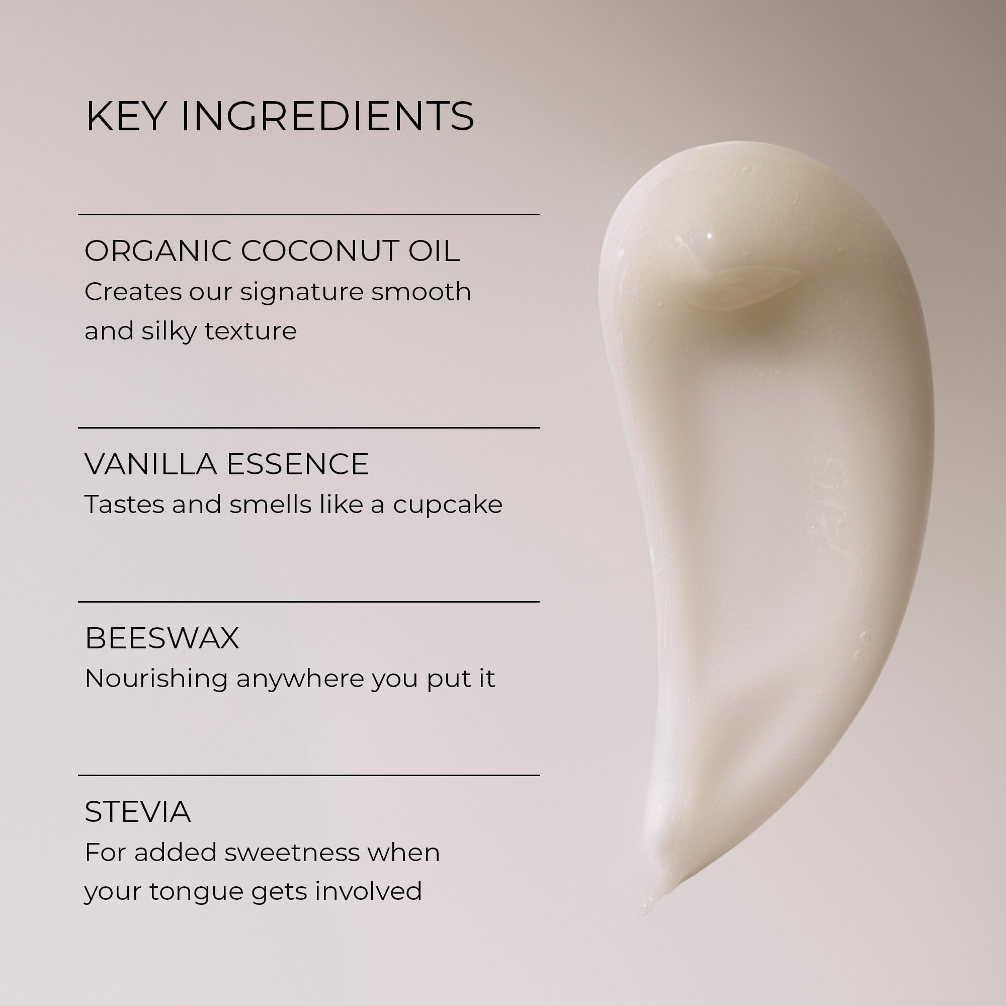 As a versatile product, it doubles as a massage oil. Immerse yourself in the delightful scent and taste of vanilla cupcakes, thanks to the infusion of Vanilla Essence. Our hero ingredient, Organic Coconut Oil, provides a unique silky texture.
