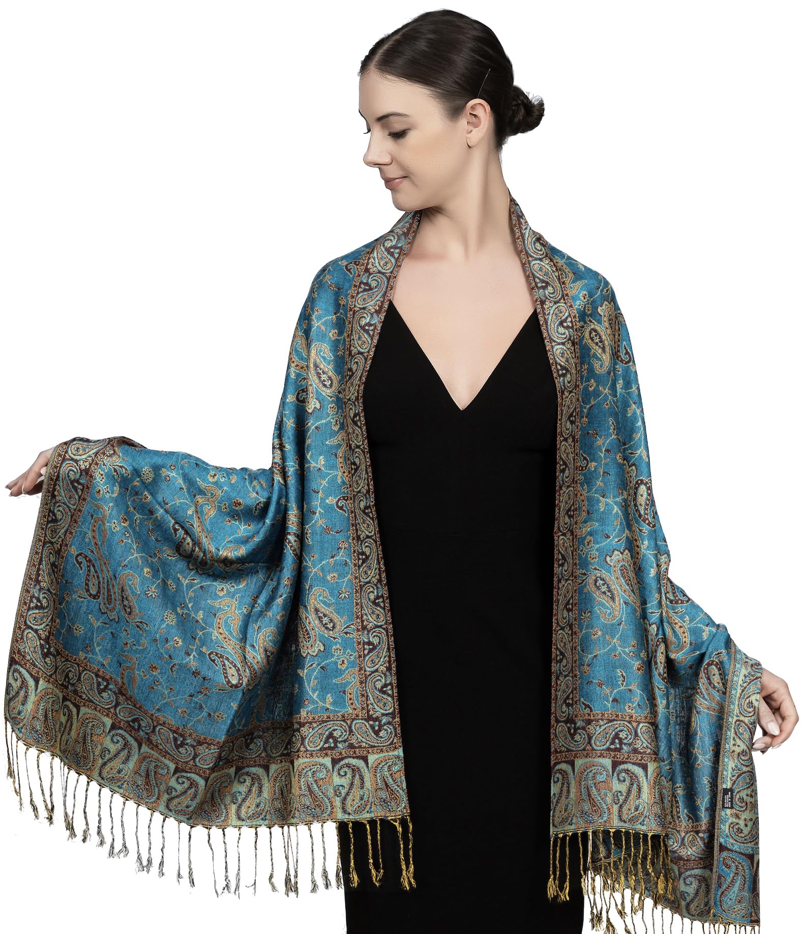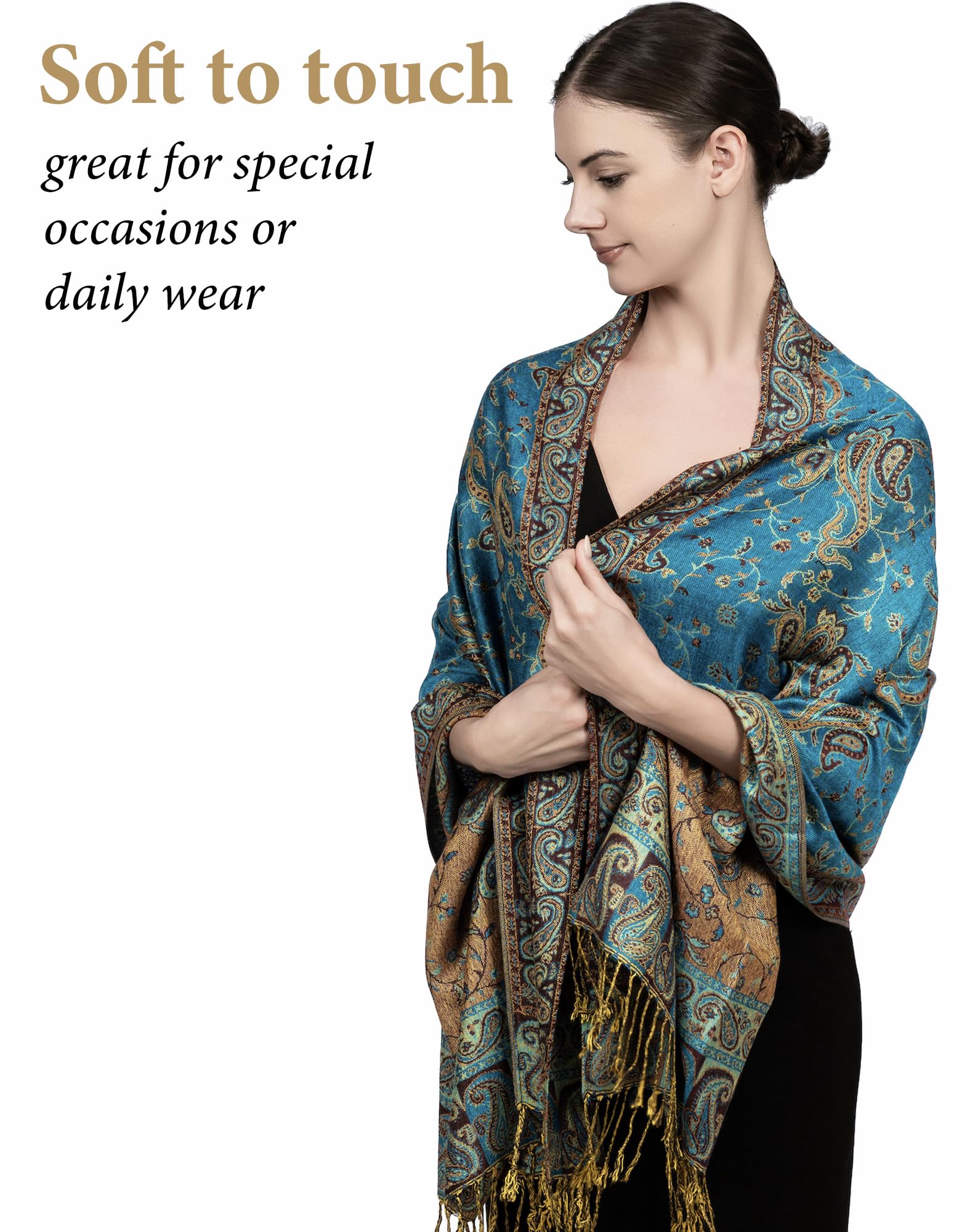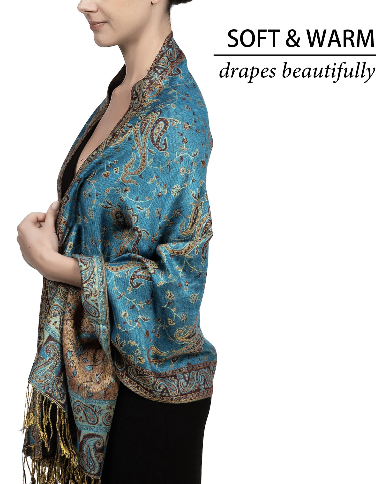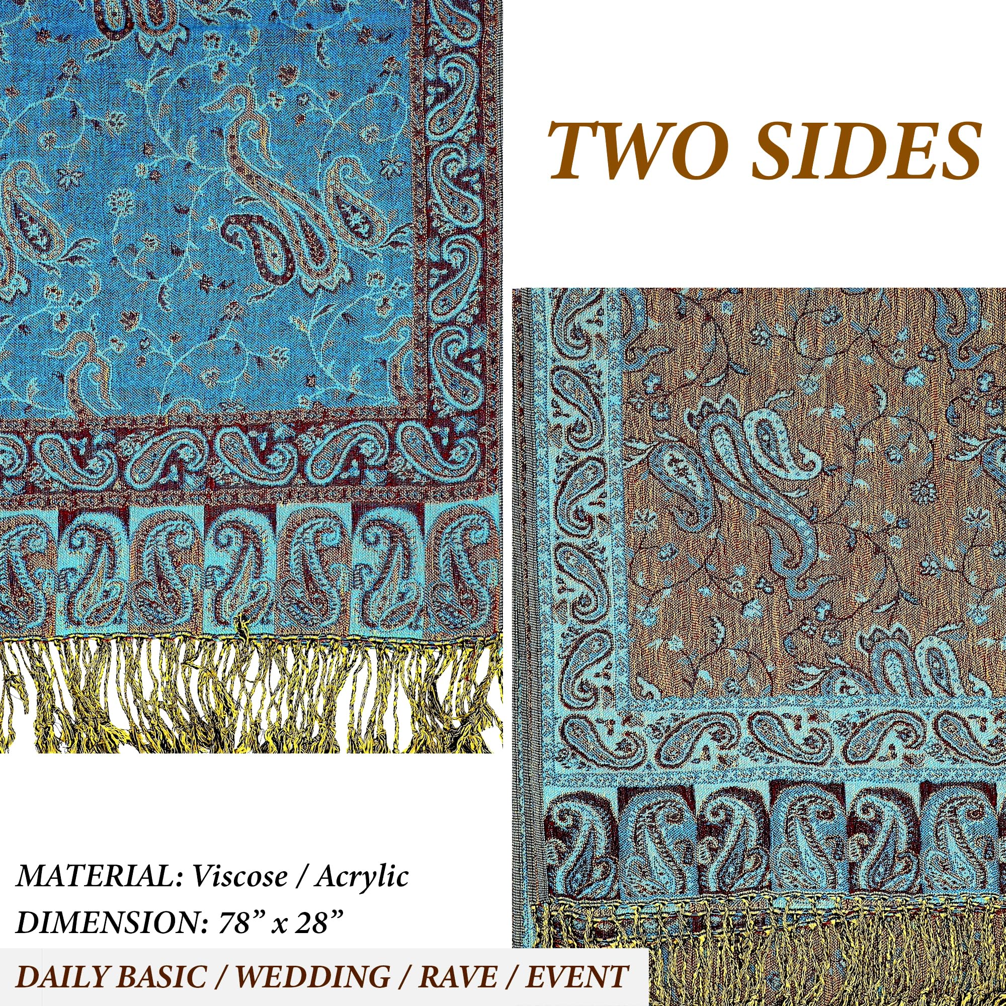 ✔️ Exotic Tapestry Look with Reversible Design – This reversible paisley shawl wrap for women features two beautiful color tones in one piece. It complements everything from evening gowns to rave outfits for men and women, offering vibrant style with graceful comfort.