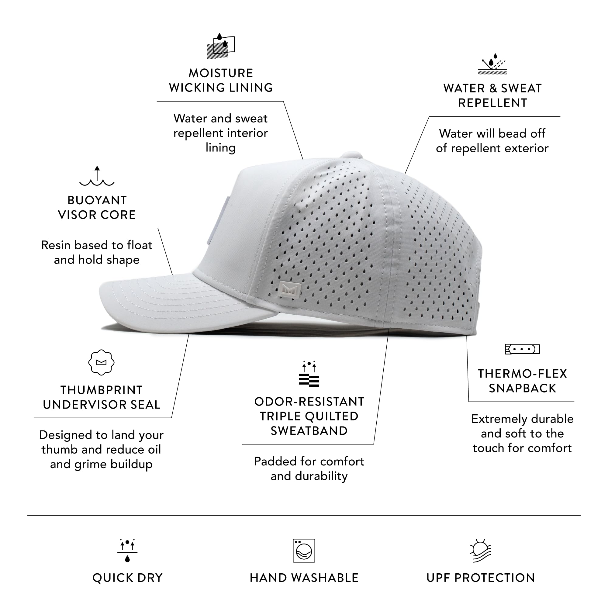 PERFORMANCE SNAPBACK HAT: Exterior crown has hydrophobic crown panels, laser-perforated side & rear panels for breathability, and custom soft touch snapback closure. Honeycomb Visor is designed for weight reduction and packability