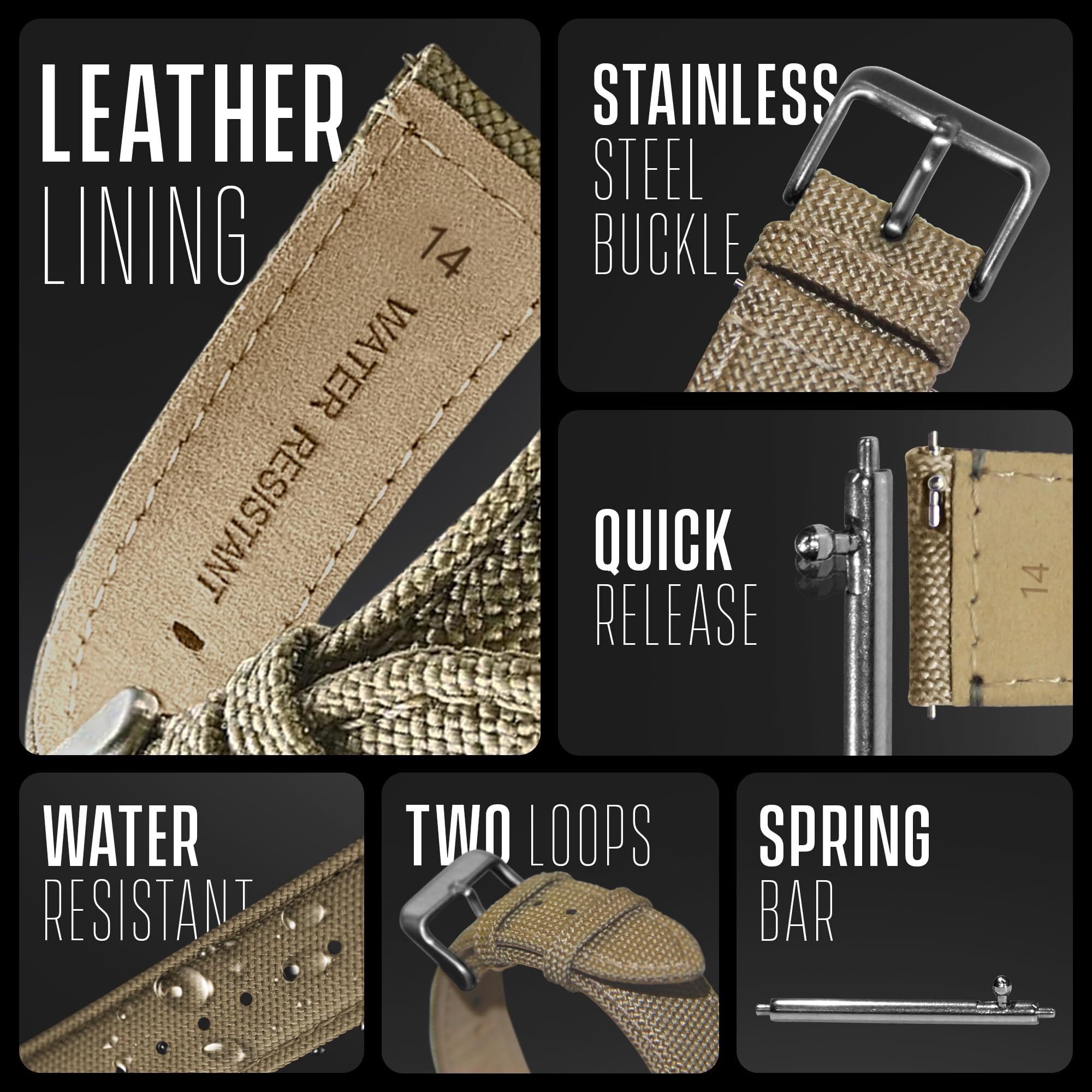 Description Immerse yourself in innovation with our cordura fabric watch bands, thoughtfully designed to seamlessly enhance a diverse range of watches and brands, ensuring an impeccable match for your timepiece. Experience the pinnacle of durability with our watch bands for men, meticulously crafted from top-tier fabric to deliver unparalleled resilience. Featuring a premium-grade fabric with exceptional tensile strength, these men's watch bands stand resilient in challenging environments, maintaining their elegance without deformation or cracking for enduring sophistication. Embrace user-friendly convenience with our 22mm watch band, it comes with quick release spring bars. The intuitive design guarantees a seamless experience, while the secure buckle closure on our cordura watch strap assures a snug and comfortable fit on your wrist. Enjoy universal compatibility as our men's watch bands effortlessly cater to both traditional watches and smart watch band models, including Galaxy Samsung watch bands. Elevate your watch-wearing journey by achieving a stylish wrist presence, complementing your overall aesthetic, and enhancing the entire experience by wearing our cool watches for men. Our wristbands offer an ideal fit, accommodating wrist sizes from 6" to 7 3/4'' men's band resist cracks, odors, and hardness even in the most rugged sports or activities, ensuring a perfect combination of comfort, flexibility, and durability. Material Top Quality Cordura fabric Water Resistant Leather Lining Compatibility Fits any 14mm, 16mm, 18mm, 20mm, 22mm watch wrist size 6” to 7 3/4'' Color Black, Olive, Grey, Khakhi, Blue, Red, Orange
