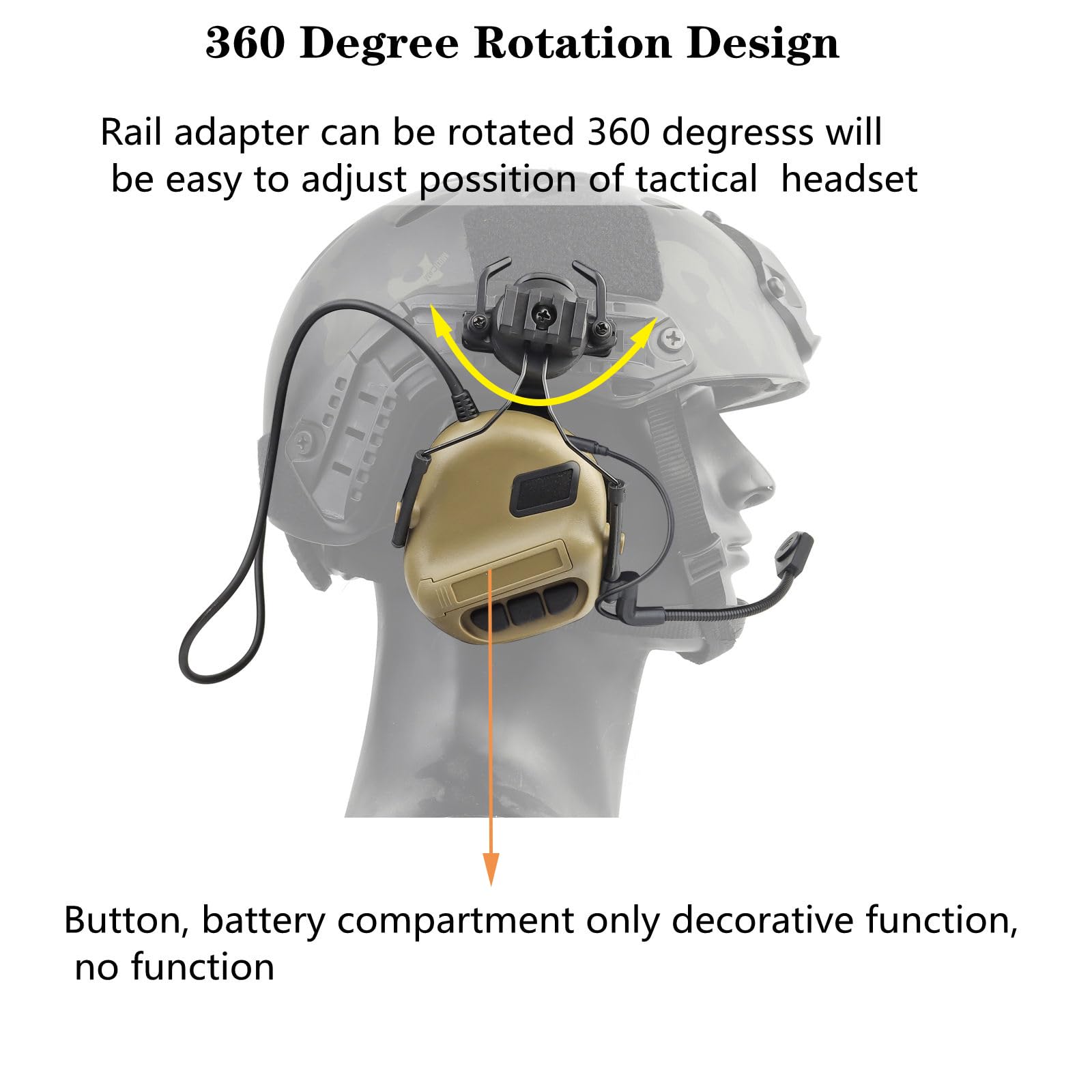 Tactical headphone comfort,Wide and comfortable ear cups with ultra-soft cushions; for adjustable fit without pressure,360° swivel design allows headset to swing up and out of the way when not in use; detachable microphone can be installed on left or right as needed