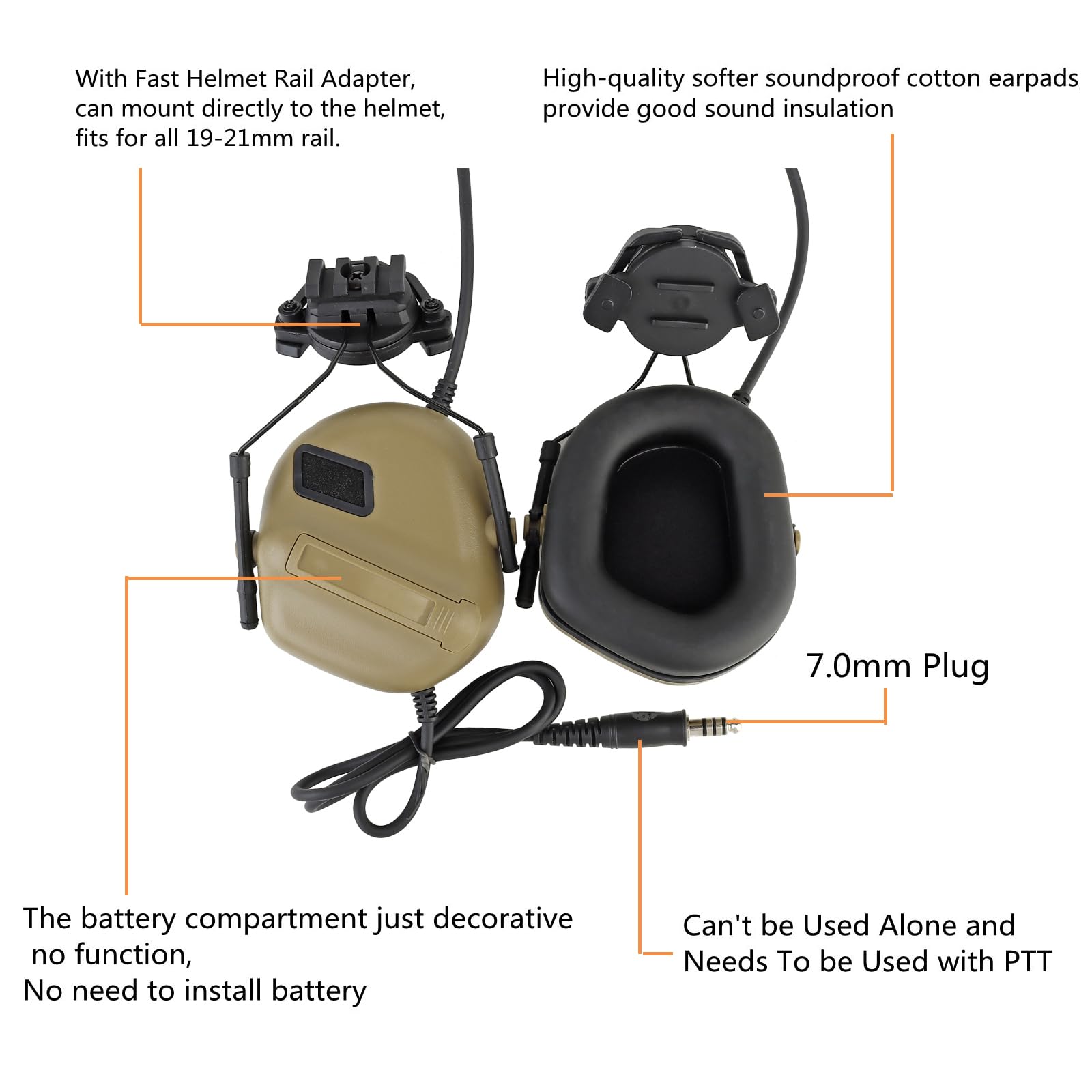Communication Function:Tactical headset version for clear communication only, does not include noise reduction feature. Requires use with PTT; battery slot and buttons are decorative, not functional