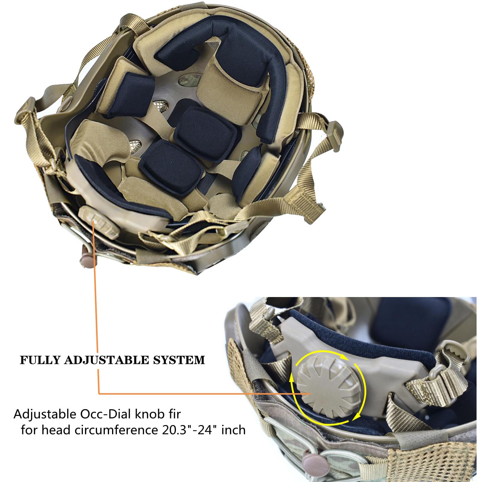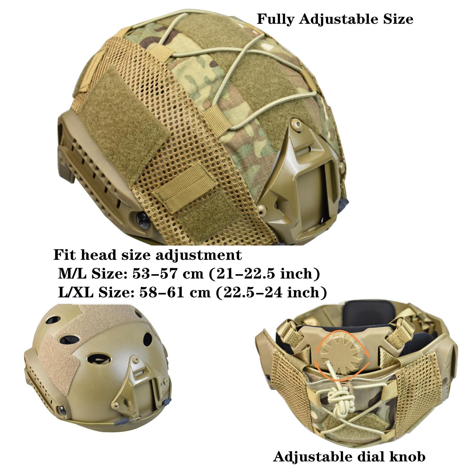 Adjustable helmet size,Occ-Dial knob Adjustable tightness,The helmet can be adjusted to M/L size,head circumference 20.5 - 26 inches,This tactical helmet can fit most people,Please feel free to choose