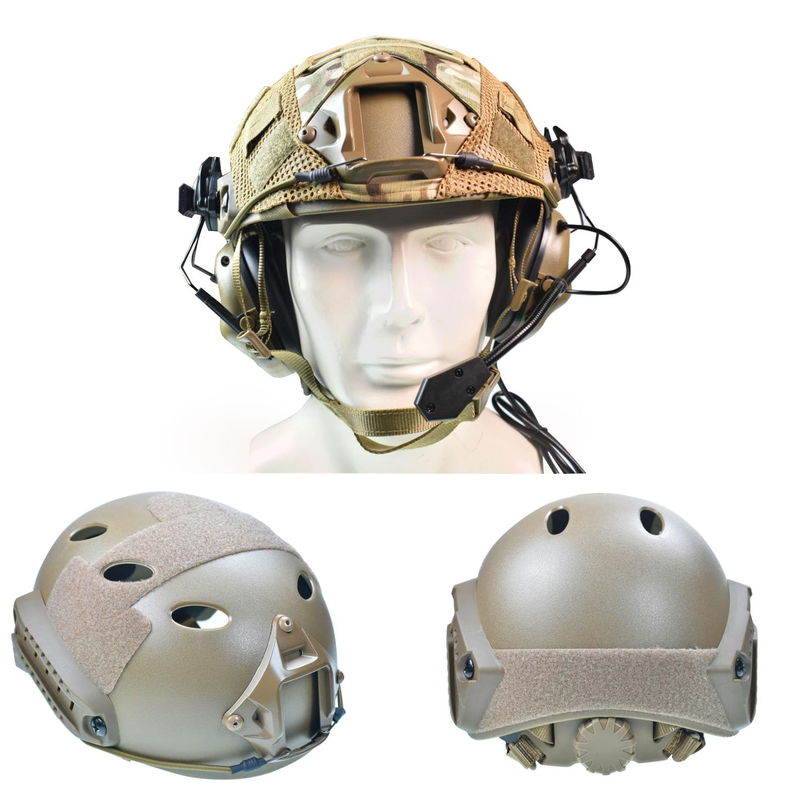 What will you get? you gets a PJ type tactical helmet,Tactical Headset , 2 set of thickened sponge mat pads, a tactical helmet cover, a set of helmet accessories ,designed for airsoft, paintball, cs, and other outdoor activities