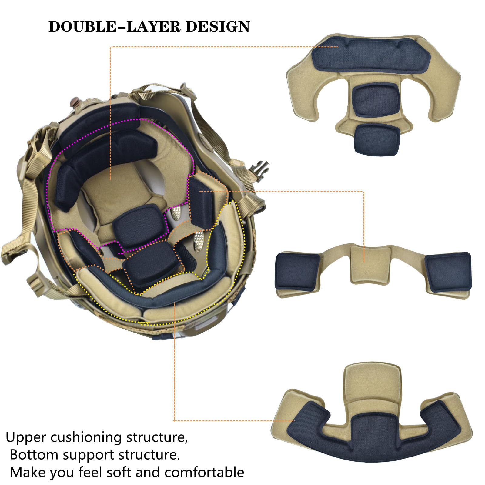 Comfort and Breathability,This helmet set comes with 2 sets of thickened sponge helmet mat pads, Made of High-Quality Memory EVA foam material, Double-layer Design,Upper cushioning structure, bottom support structure. Make you feel soft and comfortable.You can choose the right tactical helmet pad based on the size of your head circumference,When you wear it, the helmet pad will make you feel extremely comfortable
