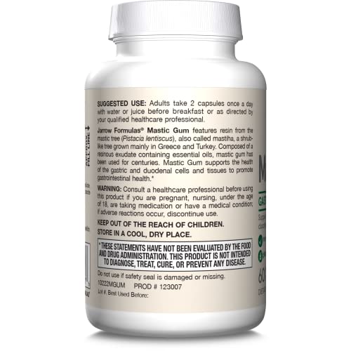Jarrow Formulas Mastic Gum 1000 mg Veggie Capsules support your stomach and duodenal health with two easy-to-take daily capsules.* Made with high-quality, non-GMO ingredients, this vegan and gluten free dietary supplement contains no wheat, soybeans, dairy, egg, fish, shellfish, peanuts, tree nuts or sesame. Mastic gum has been used for more than 2,500 years. Each serving of these supplement capsules provides 1000 mg of Mastic Gum obtained from naturally-sourced resin from the Mastic Tree, which supports the health of gastric and duodenal cells and tissues to promote gastrointestinal health.* Suggested Use: Adults, take two capsules once a day with water or juice before breakfast, or as directed by your qualified healthcare professional. Informed by strong scientific research, Jarrow Formulas products are carefully crafted to ensure you get the benefit of each and every vitamin, mineral and supplement.