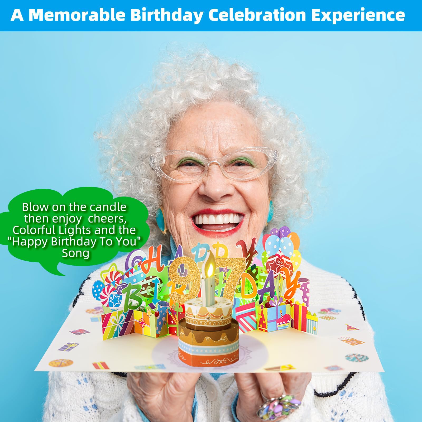A SHINNING & MUSICAL POP-UP CARD: Gumry 97 years ord birthday card is an exceptional way to “wow” someone on their birthday,features a beautiful pop-up collage design,has color-changing lights and plays classic "Happy Birthday" song to enhance the birthday celebration atmosphere. Opening it up is like opening up a birthday cake with a song and a picture to “Wow”the birthday protagonist