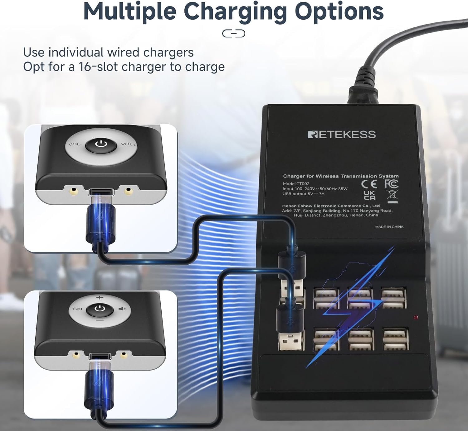 Efficient Charging; This tour guide set equipped with a 16-port charger; with 16 ports at your disposal; you can simultaneously charge multiple devices; less time tethered to an outlet
