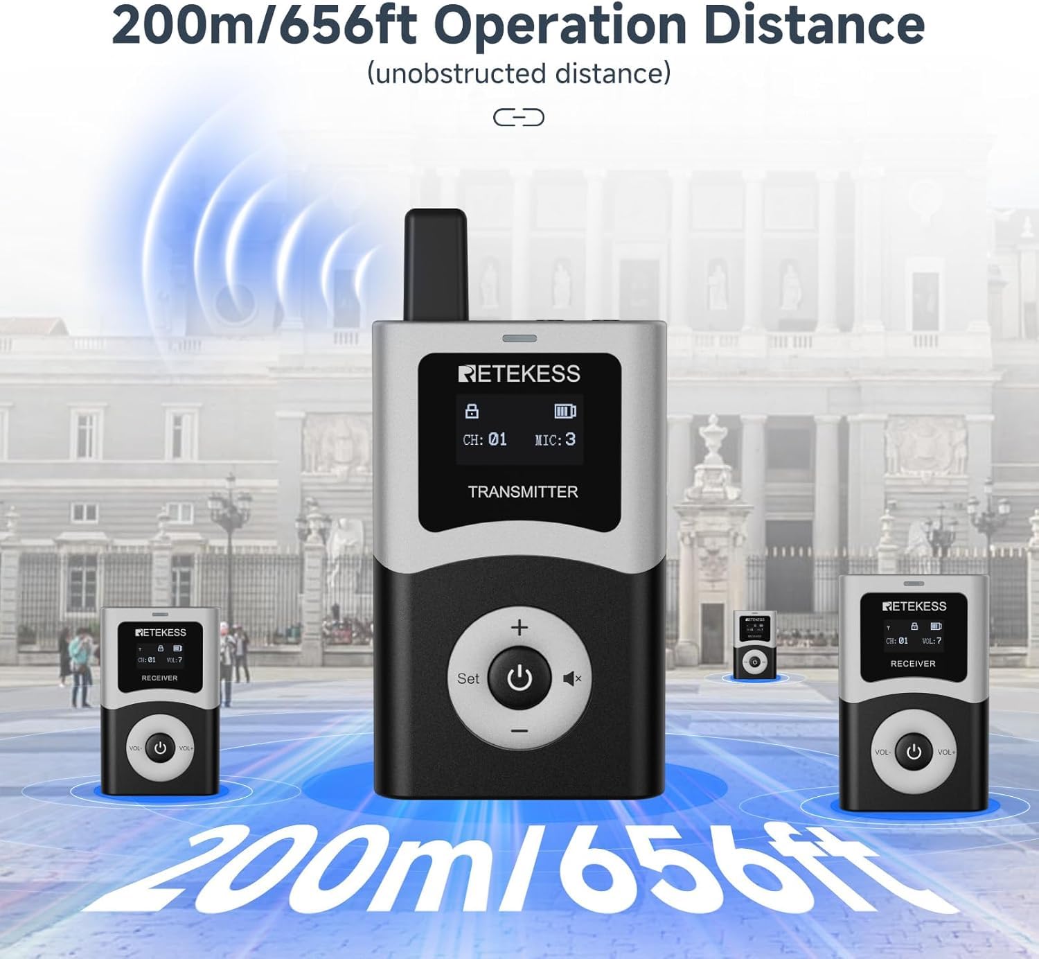 200M Working Range (unobstructed distance); Audio Tour Guide System exploring vast landscapes and intricate urban settings without missing a single detail; U band tour guide system boasts 200-meter working distance; while staying connected to informative content