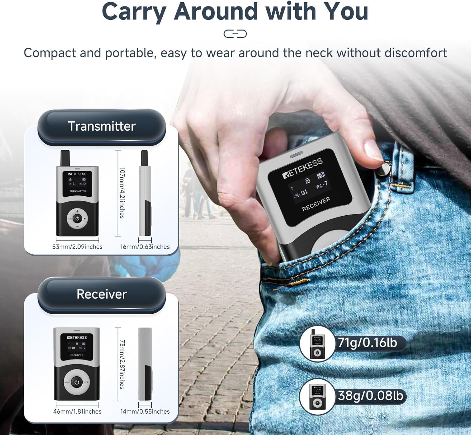 Flexible and Portable; Lightweight U band tour guide system; 71g transmitter and 38g receiver; whether you're exploring a new city or embarking on a multi-day hiking trip; ultra-lightweight design ensures that you can carry it around with absolute ease