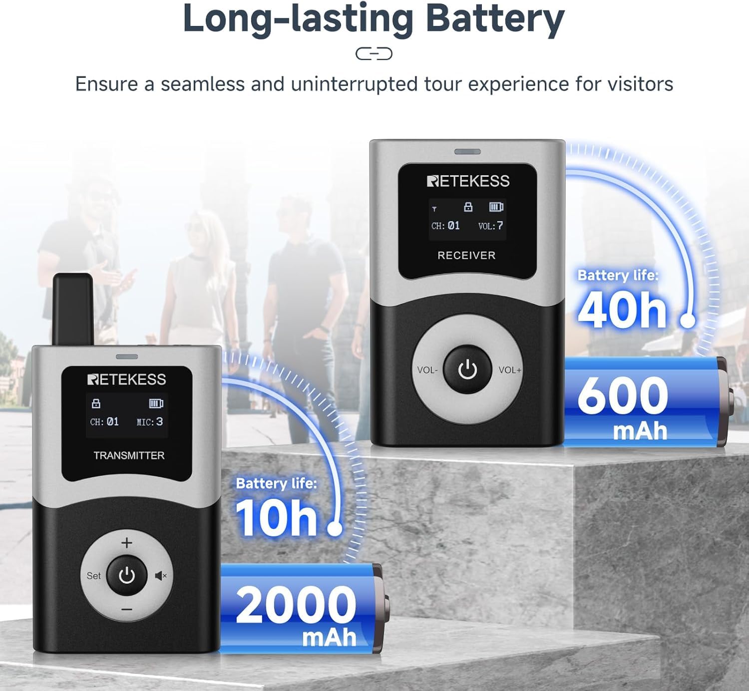 Long Enough Battery Life; Whisper Tour Guide System transmitter ensures 10 hours of operational excellence; receiver lasts for 40 hours; experience an uninterrupted journey of exploration, enjoy the unlimited exploration fun brought by the wireless tour guide system, Say Goodbye to Frequent Charging