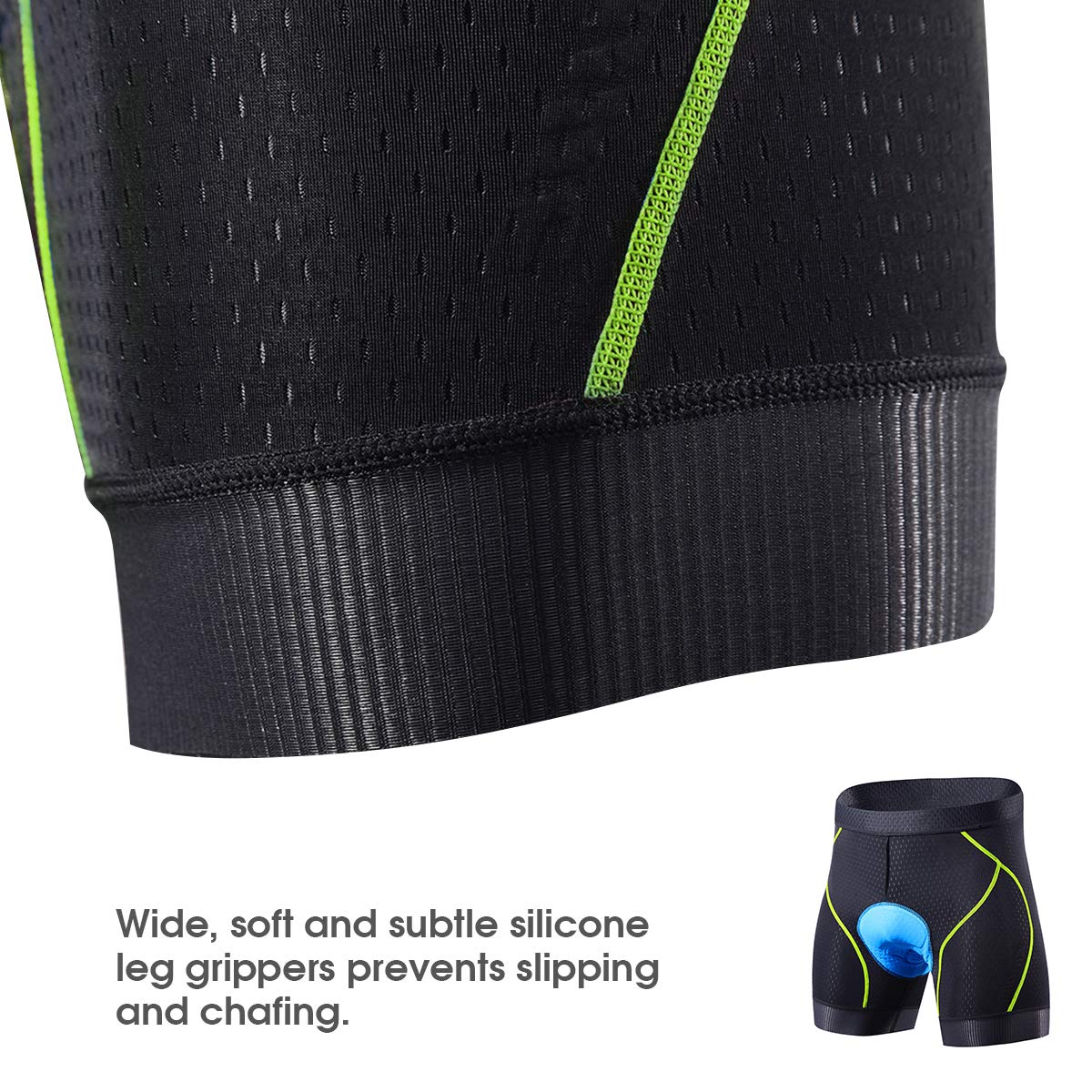 Anti-slip Leg Grips: The 1.8inch width, soft and subtle silicone leg grippers eliminate slipping and chafing and keep the chamois pad in the right place, letting you enjoy a comfortable long ride.