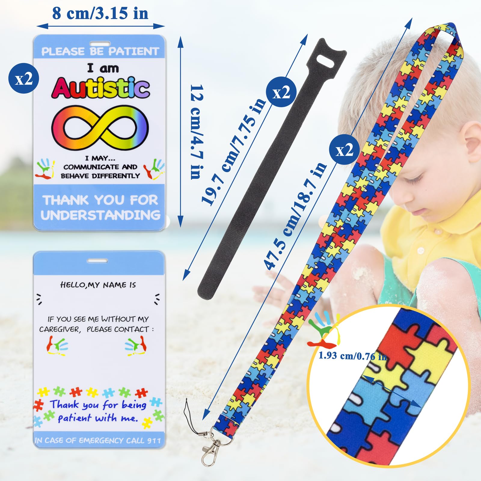 What will you get: You will get 2 autism safety tag cards, a lanyard and 2 hook and loops for your daily use. Perfect for people with autism and their teachers, family and friends.