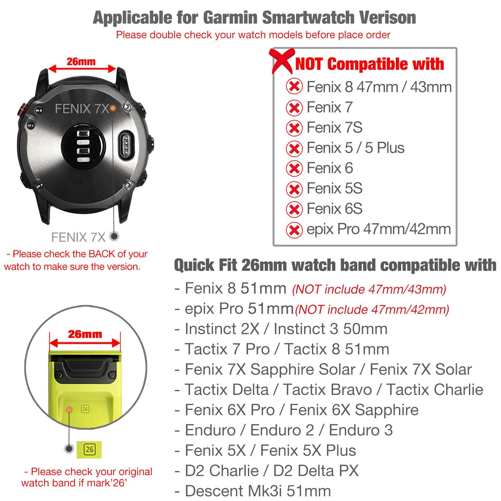 -- Compatible Models, 26mm watch band Compatible with Garmin Tactix 8 51mm, Instinct 3 50mm, Fenix 8 51mm, Fenix 7X Sapphire Solar / Fenix 7X Solar, Fenix 6X Pro / 6X Sapphire Solar ,Fenix 5X /5X Plus,D2 Charlie/D2 Delta PX,Enduro/ Enduro 2 /Enduro 3, epix Pro 51mm, Instinct 2X, Descent Mk1 / Descent Mk2i / Descent Mk2 ,Tactix Delta / Tactix Charlie / Tactix Bravo, Quatix 3 ,Fenix 3/Fenix 3 HR . --Please check your original watch band whether mark ‘26’ , if yes, the watch band fit your Garmin watch, ONLY Watch Band, NOT inclued smart watch.
