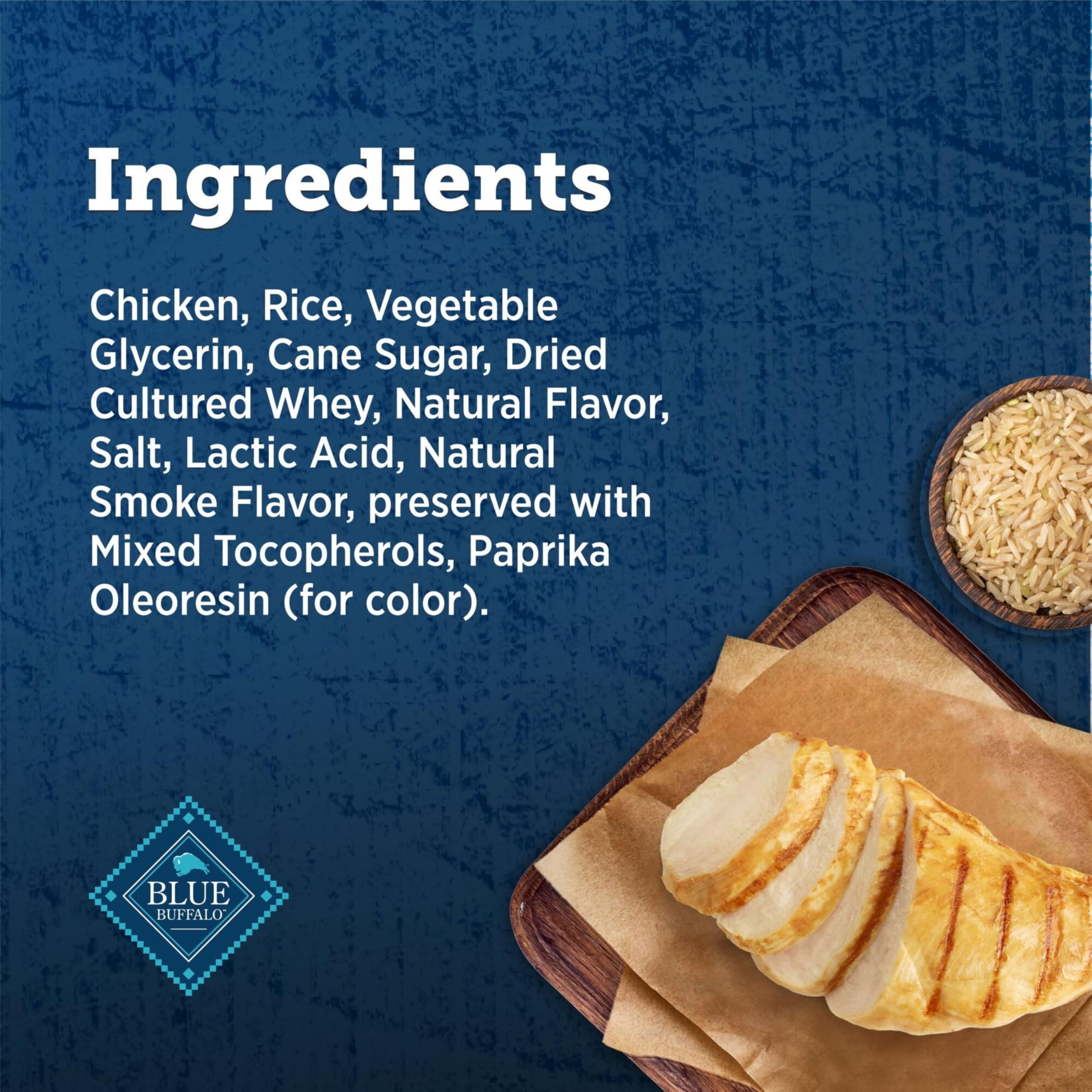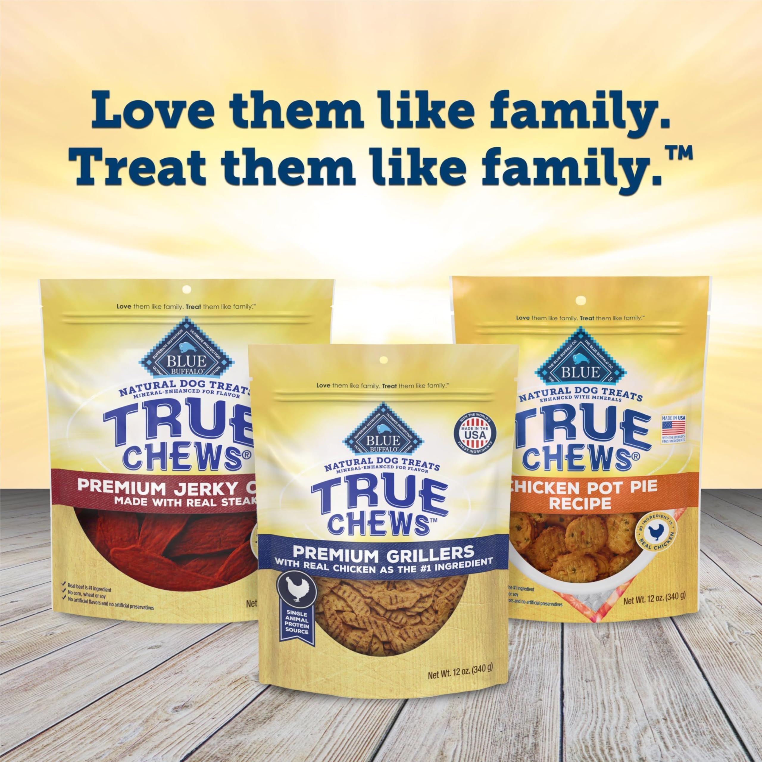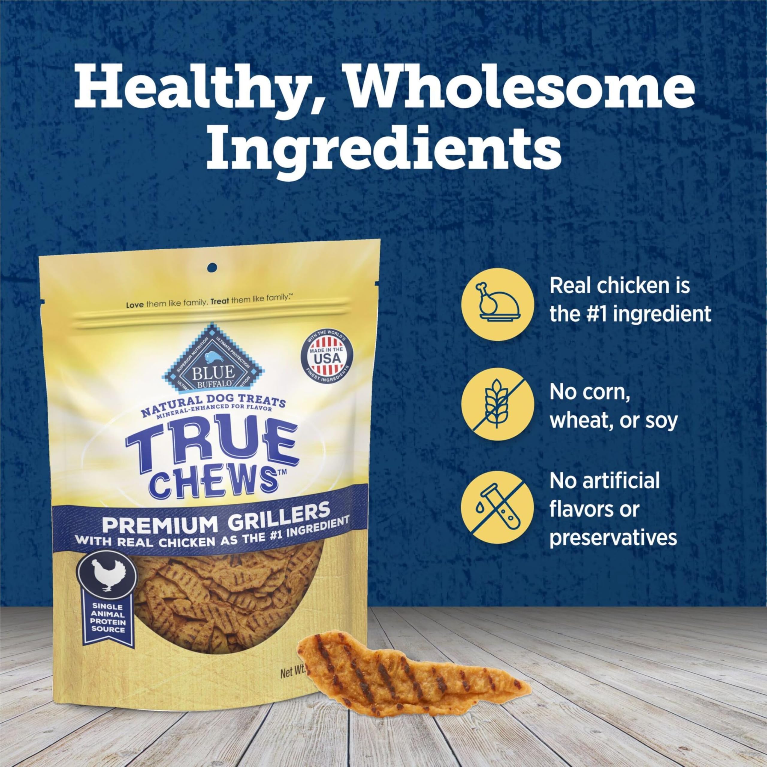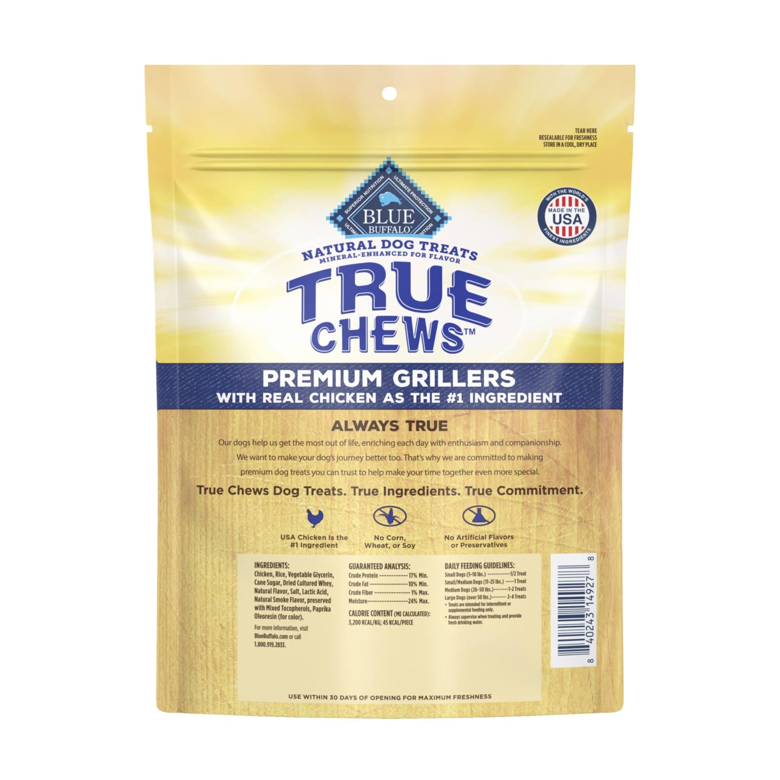 Contains: One (1) 12-oz bag of BLUE True Chews Natural Premium Grillers Dog Treats, Chicken Recipe