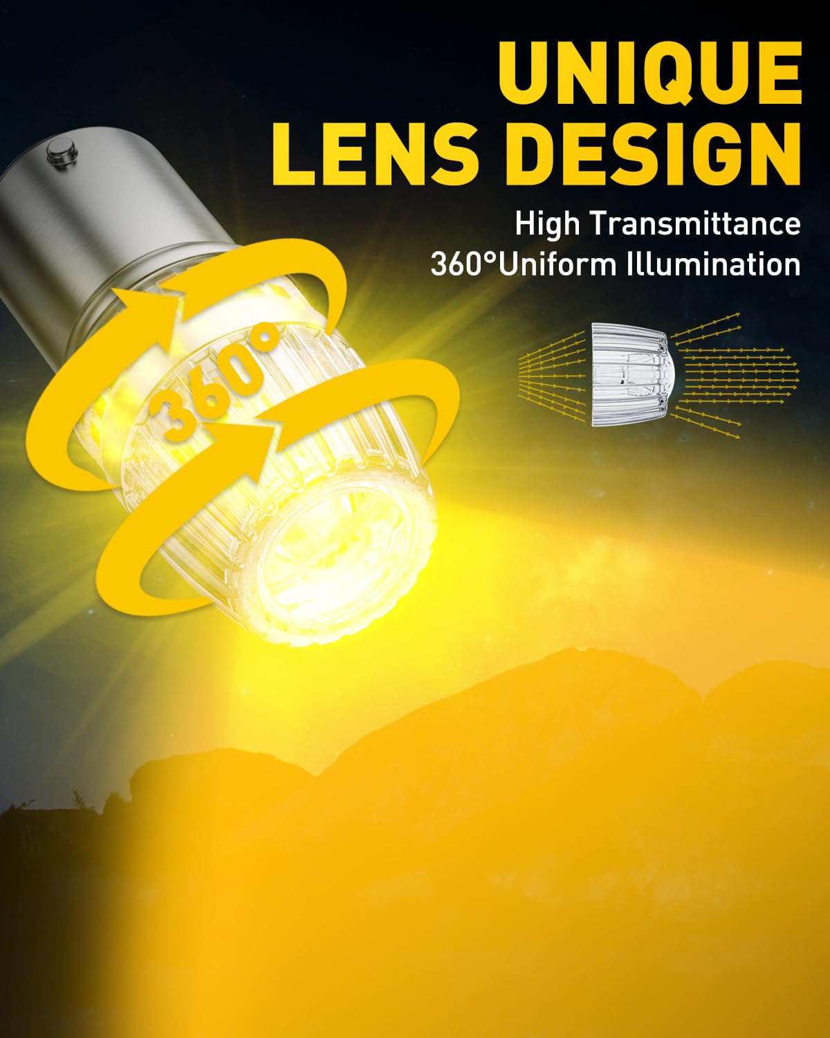 Unique Lens Cover Design:Unlike most 1156 amber yellow LED bulbs without lenses, ours features a custom optical lens. It delivers 95% high light transmittance, ensuring light is fully and evenly distributed. The lens diffuses harsh light rays into soft glow, which won’t dazzle other drivers. It provides a comfortable visual experience for you while protecting the safety of oncoming or following vehicles.