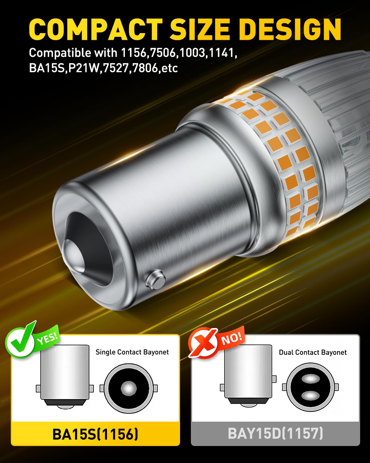 5 Mins Easy Installation:Non-polarity design fits US standard and CK sockets, perfectly fits 1156 1003 BA15S P21W 1156A 1156NA 87 93 97 97A 97NA 199 631 1073 1095 1141 1195 1295 2396 3497 5007 5008 7506 12088 1295NA, socket types. Suitable for car backup lights, reverse lights, tail lights, brake lights, turn signal lights, parking lights, daytime running lights, and so on. Even beginners can finish installation in 5 minutes by directly replacing the original halogen amber yellow 7506 bulb. (Please confirm your car’s bulb model before purchasing).