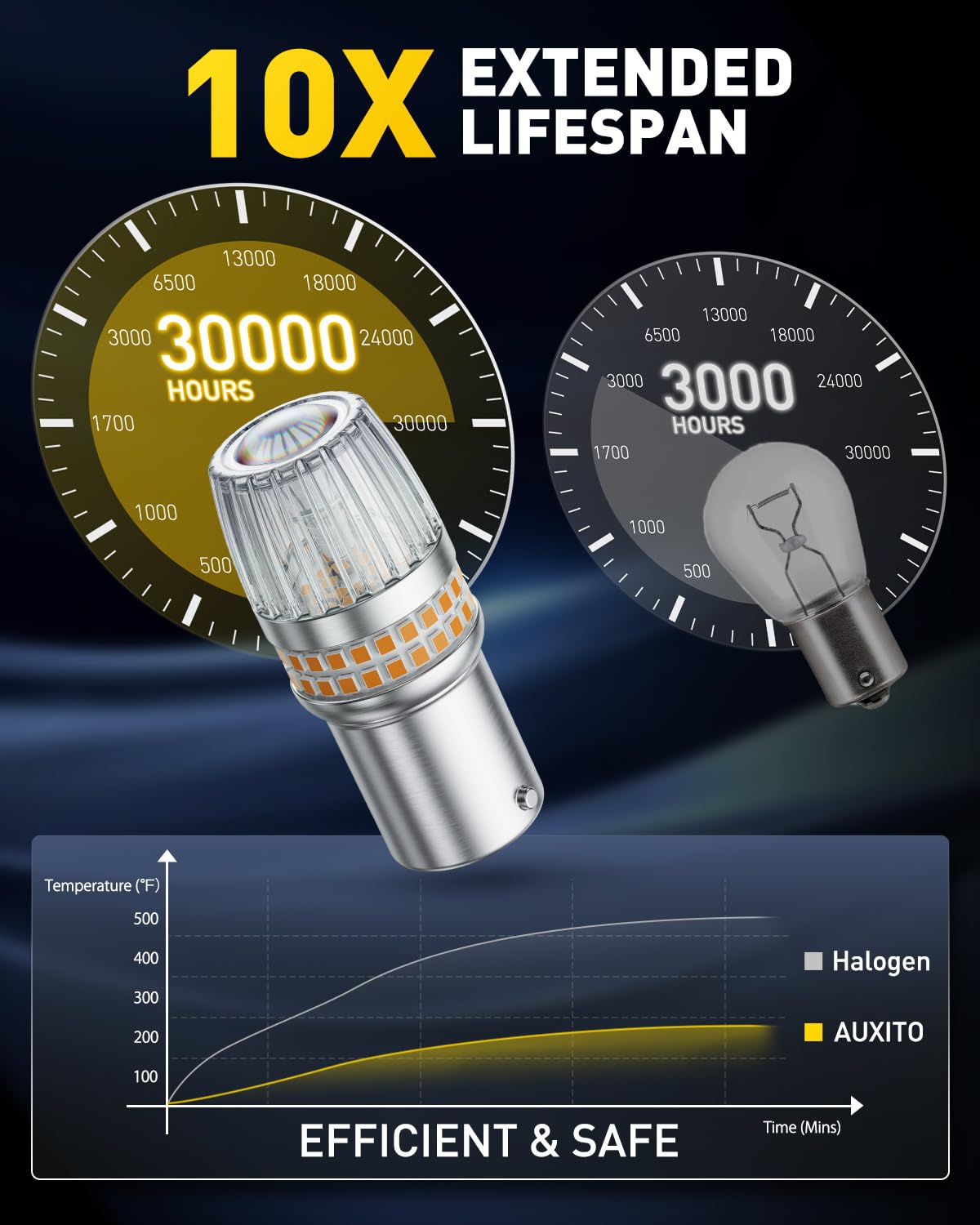 Durable & Long-Lasting:Made of aviation-grade aluminum body and scratch-resistant optical lens, accelerating heat conduction and diffusion for a significant boost in heat dissipation efficiency, preventing premature aging of LED chips caused by overheating. The service life of these ba15s led amber bulb is up to 30,000 hours, reducing the frequency of bulb replacement.