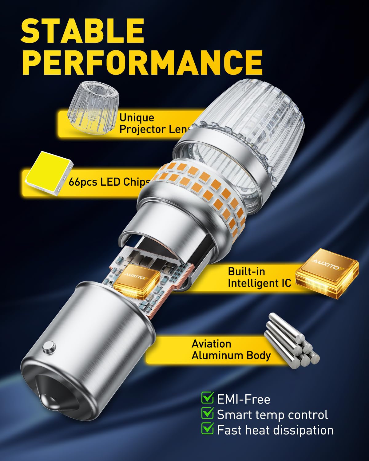 700% Brighter Than Traditional Halogen Bulbs:With the lens boosting light utilization, the 1156 led bulb emits super bright amber yellow light—700% brighter than traditional halogen bulbs. 360°full-angle light output with 66 high-precision SMD chips provides clear and bright illumination, enhancing visibility on the road and improving driving safety at night or in bad weather.