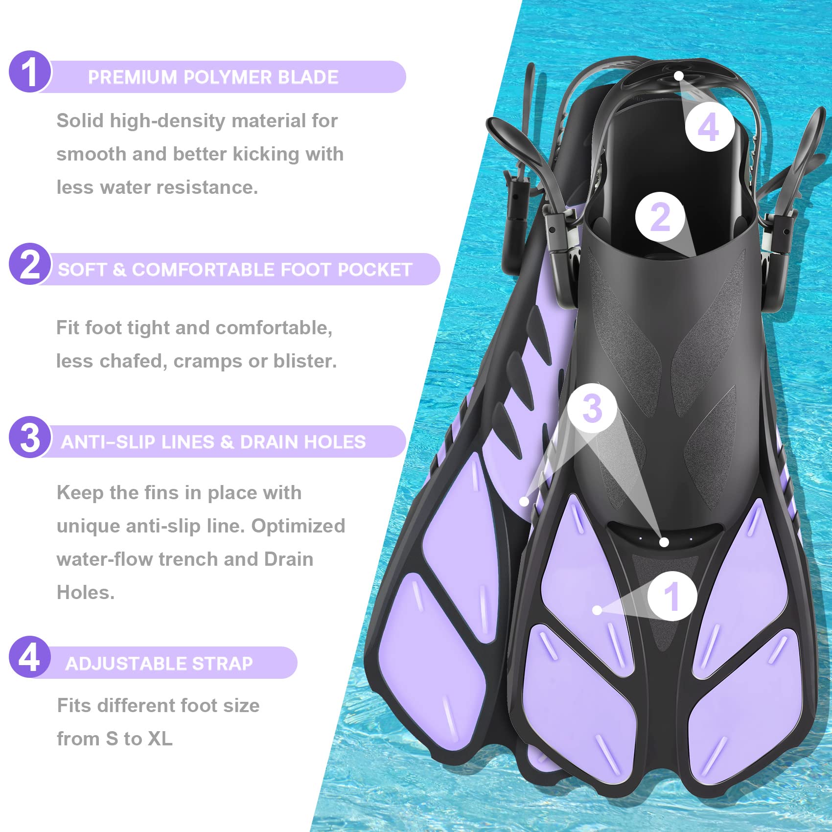 Full mask fin snorkel set: zeeporte long snorkel set with adjustable fins, two window tempered glass lens mask, dry top silicone snorkel, travel gear bag, it's the ultimate travel companion and is suitable for snorkeling, swimming, body surfing, boogie boards and much more.