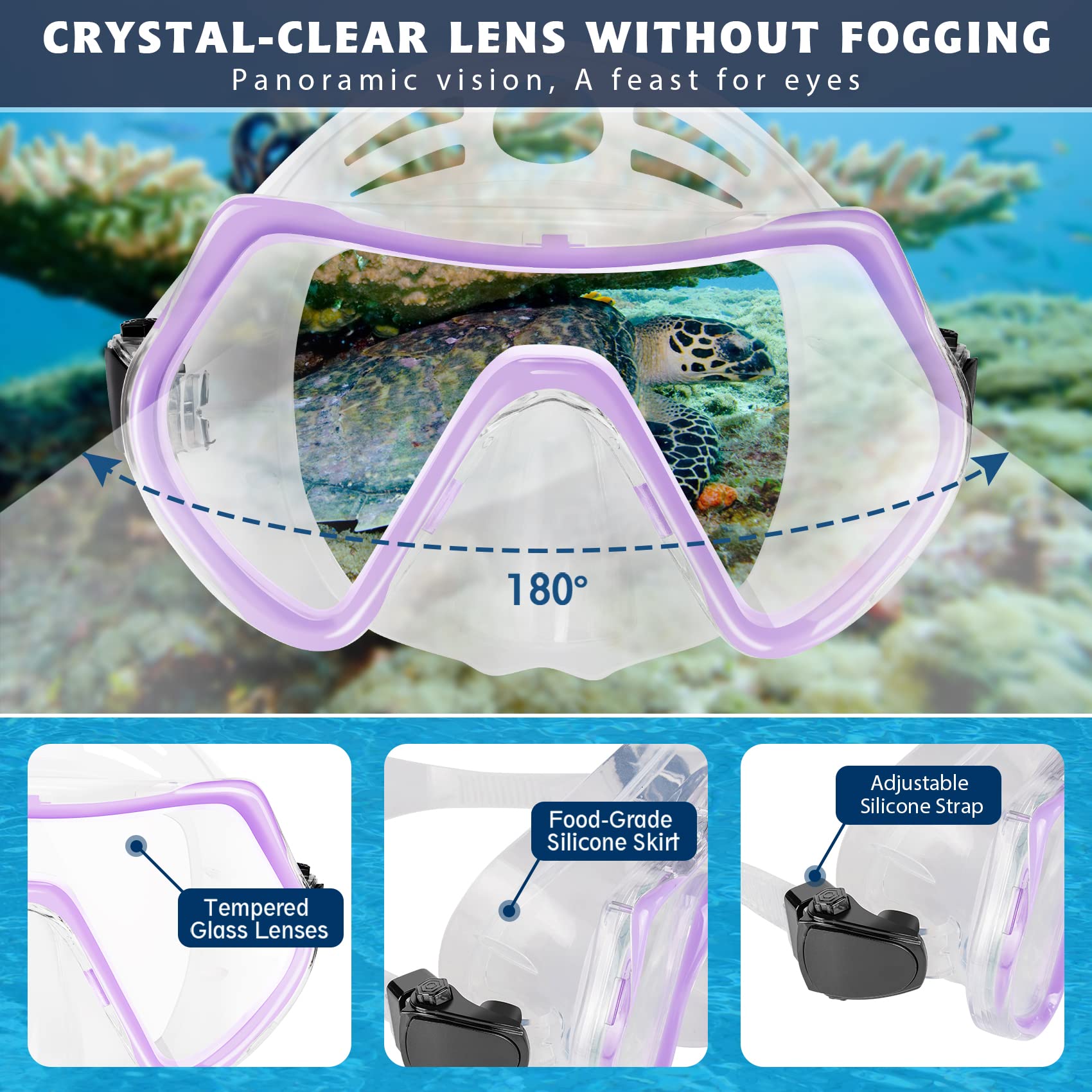 Panoramic view snorkel dive mask: made of a four-window design for a panoramic view with tempered glass lens and hypoallergenic silicone skirt, zeeporte snorkel mask can withstand underwater pressure while diving and snorkeling, ultimate comfort. the diving mask's skirt is designed with soft and flexible silicone and the food-grade silicone mouthpiece is safe creates a watertight seal with the any driver's face and attached to your mouth perfectly without any peculiar smell.