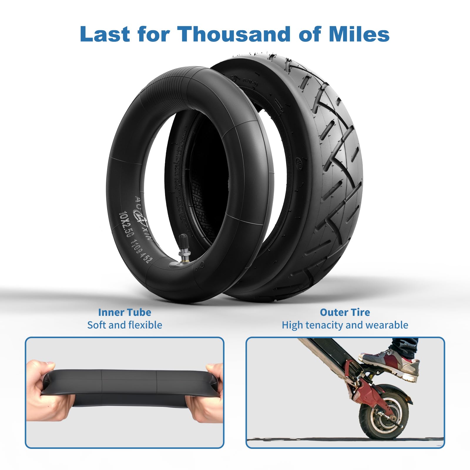 🛴【Easy to Install】: Scooter tube 10x2.5'' inner and outer tire set is so easy to replace, just ensure the valve in a right direction, it will last for thousand of miles without inflation at least. It may drive smoothly on various kinds of road surfaces, highways, rough way, stony road, sandy road, uphill road