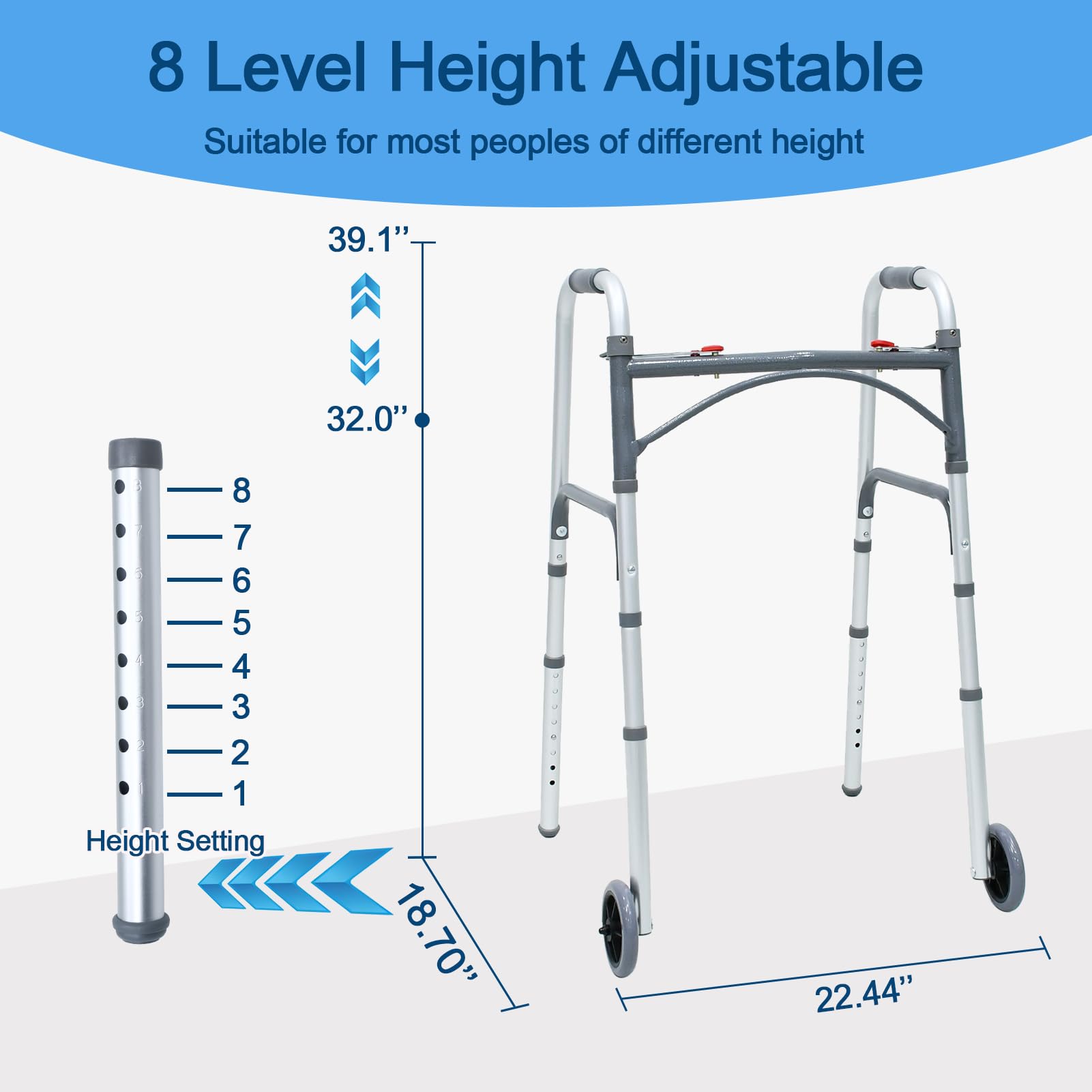 Height-adjustable:This folding walker has 8 levels of height adjustment from 32"-39" to match your most comfortable height.
