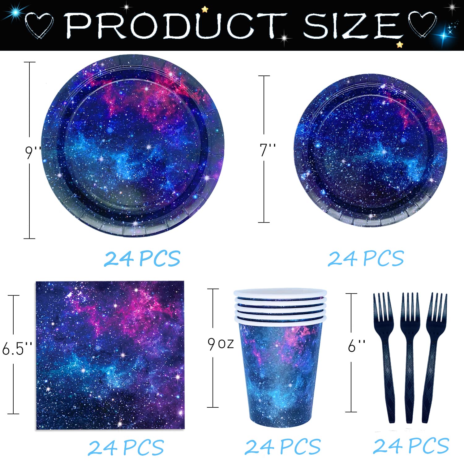 【Package content】This outer space party tableware set comes with including 24 9" galaxy plates, 24 7" space dessert plates, 24 9oz paper cups, 24 galaxy napkins (3-ply and measuring 6.5" x 6.5") 24 forks( 6 inches) totally 120pieces. Save more work than select these items individually.