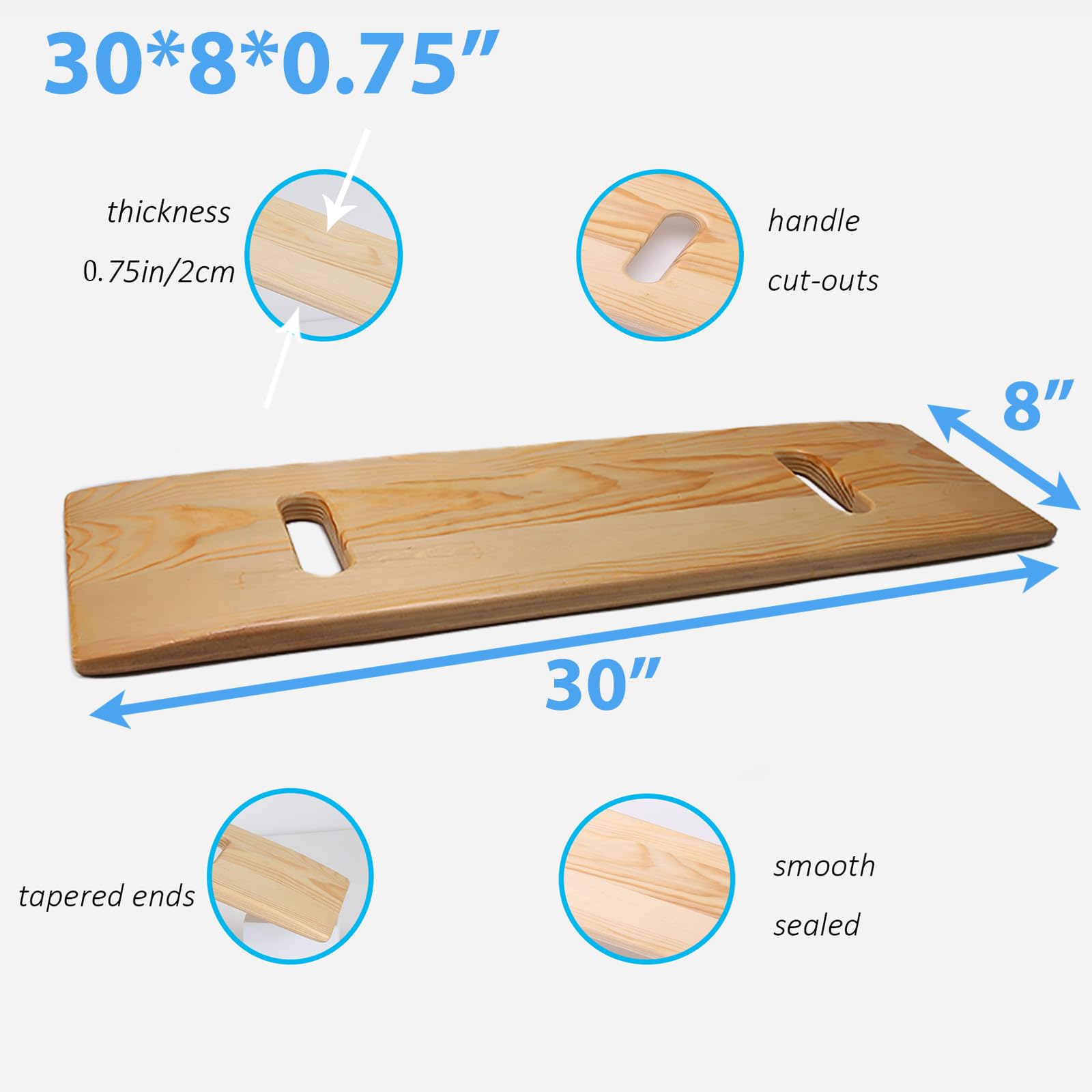 Convenient Design: The transfer board has two cutout handles for easy grip and support. The handle is shaped to accommodate a variety of hand sizes, and at the same time, each handle is finely sanded and sealed to ensure comfort and safety in use