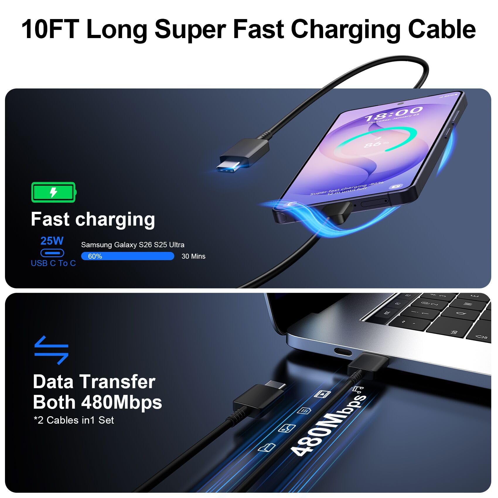 Small & Powerful: With 25W charging power but smaller size, this Samsung charger fast charging cord is more convenient and portable. Equipped with a type c port, you can charge your device back to full power in no time by using the 25W USB C fast charger for Samsung Galaxy S26 S25 series. It only takes 30min to charge your Samsung Galaxy S26/S25/S24/S23 ultra from 0 to 60%, 5 times as fast as standard USB C charger.