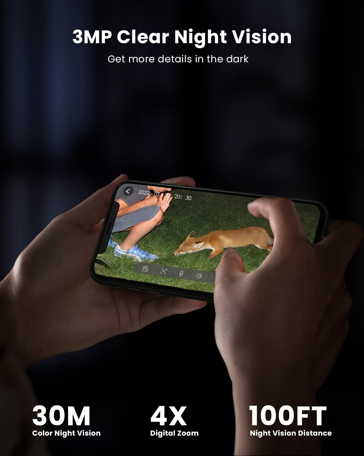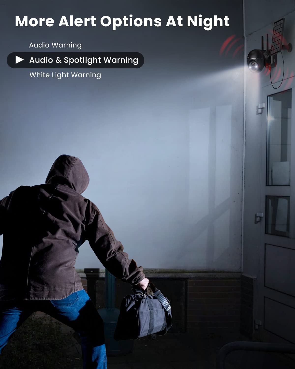 【2K HD Color Night Vision & 360° Pan and Tilt Control】The camera has a resolution of 2048 x 1536, which is 1.5 times more detailed than a 1080p camera. Built-in 2 white lights provide you with clearer color night vision. View high-definition images even in the dark of night to effectively identify potential threats. With a 355° pan, 120° tilt and 4x digital zoom (no auto-tracking), the security cameras wireless outdoor provides 360° surveillance to protect your home.
