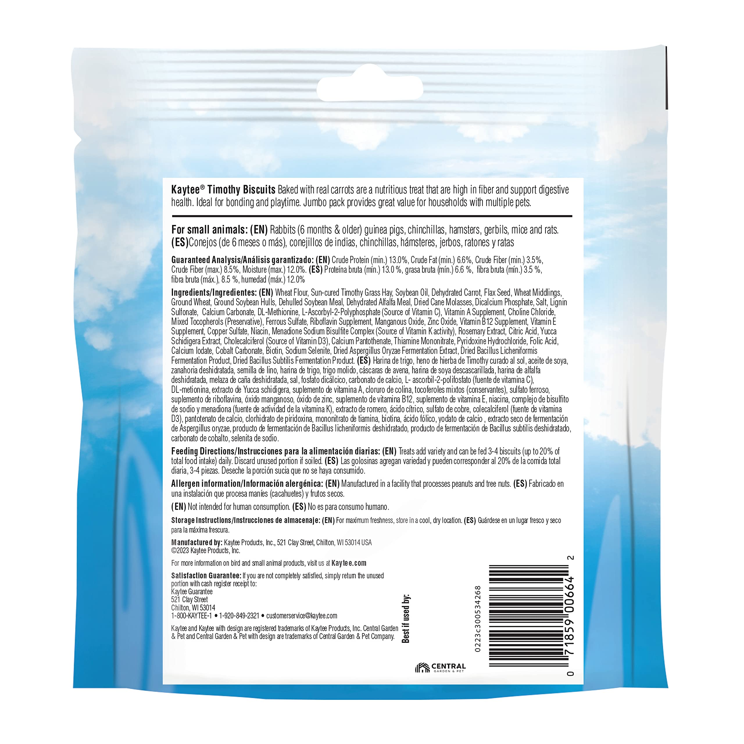 Kaytee Timothy Biscuits Baked with Carrots are a healthy and delicious treat that cater to your small animal's natural chewing instincts. These biscuits are packed with the natural high fiber of timothy grass hay, promoting optimal digestion and overall wellbeing. The carrot flavor is sure to tantalize your pet's taste buds, providing a flavorful snacking experience they will love. Kaytee Timothy Biscuits Baked with Carrots are perfect for placing in a dish or hand feeding, providing a fun and interactive way to bond with your furry friend. However, it's important to remember that treats should only be given in moderation to avoid overfeeding. These treats are ideal for bonding and playtime with your small animal!