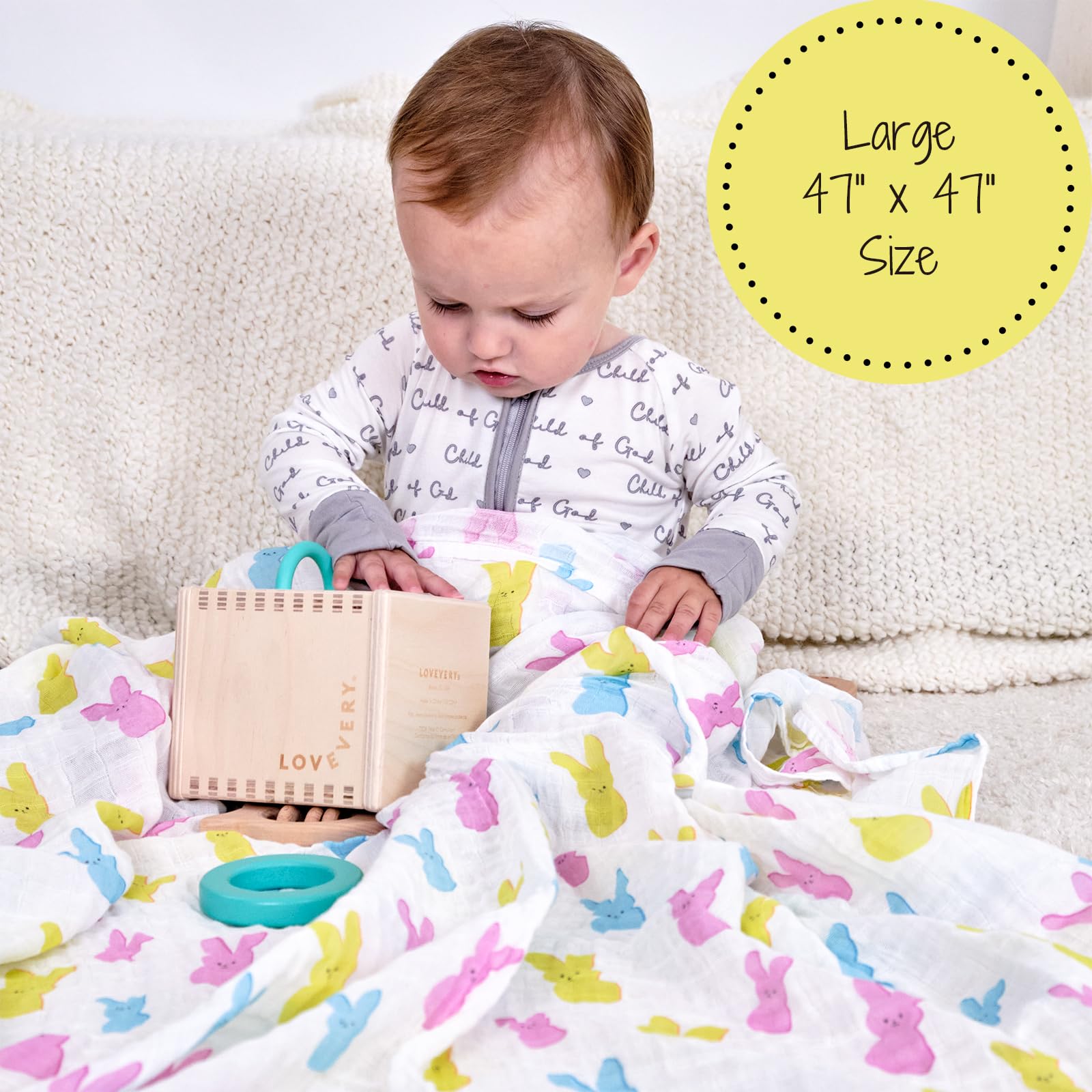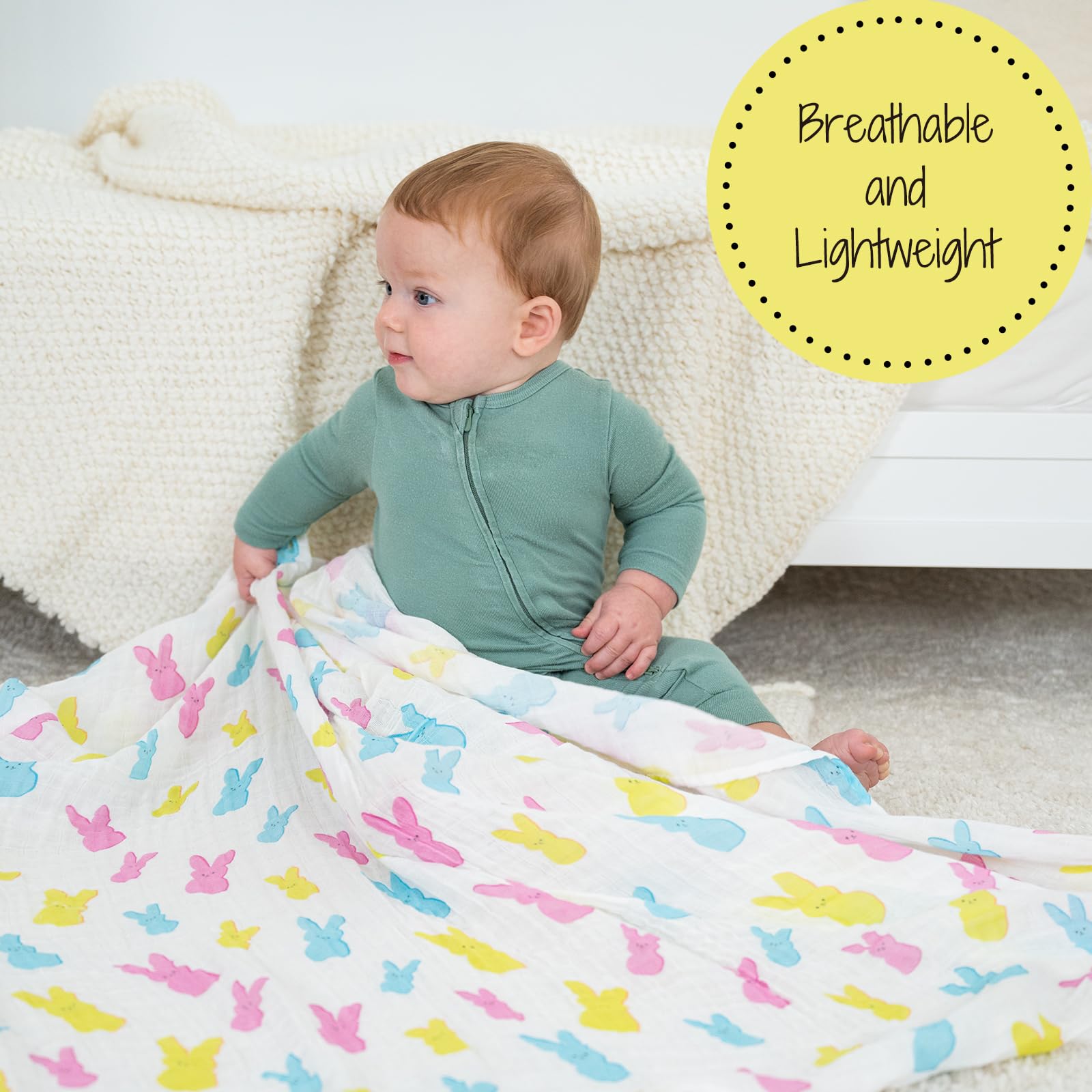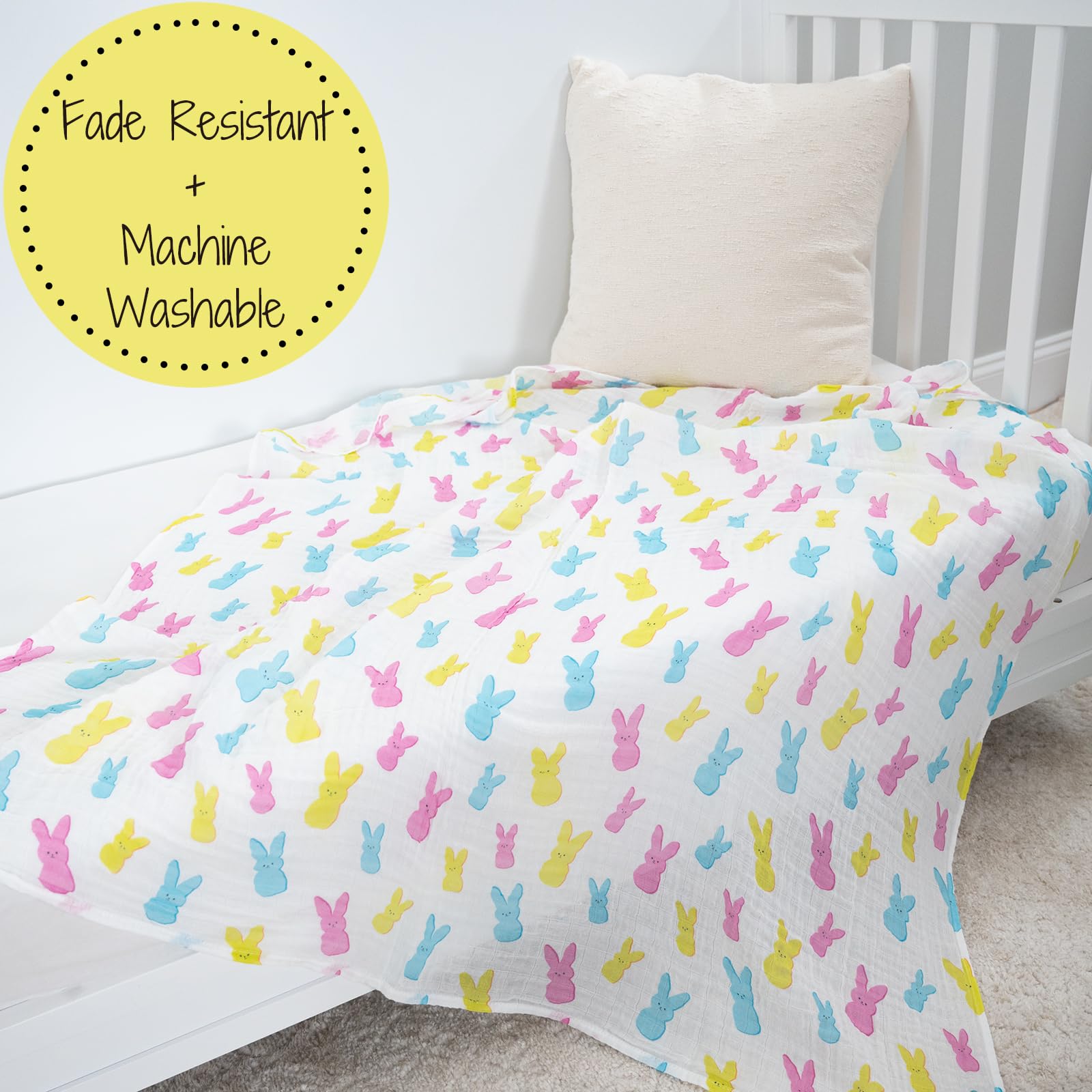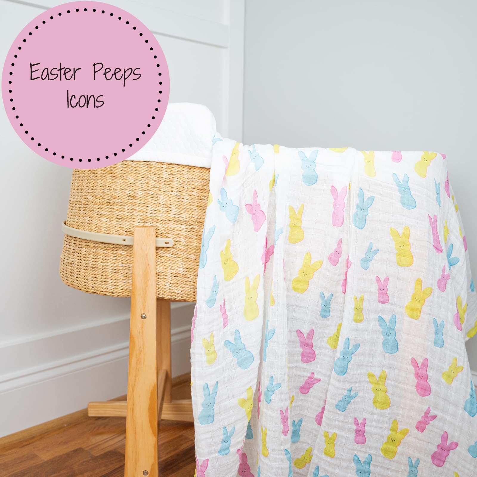 EASTER PEEPS - Wrap your baby in comfort with our muslin swaddle blanket featuring a colorful Easter candy-inspired print. It provides a cozy yet breathable environment, perfect for springtime cuddles. Moms and dads will love receiving this unique design as a baby shower or holiday gift.