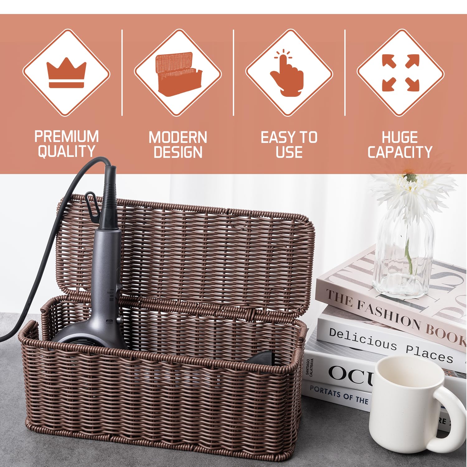 Elegant & Safe Handwoven Synthetic Rattan: Our Cantalop Cord storage organizer with attached lid boasts a handmade polypropylene rattan like plastic, adding a touch of rustic elegance to any room. This cable organizer is carefully designed to hide wires and improve your space with a charming touch.