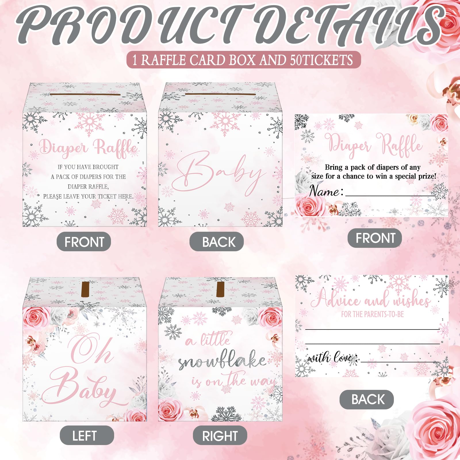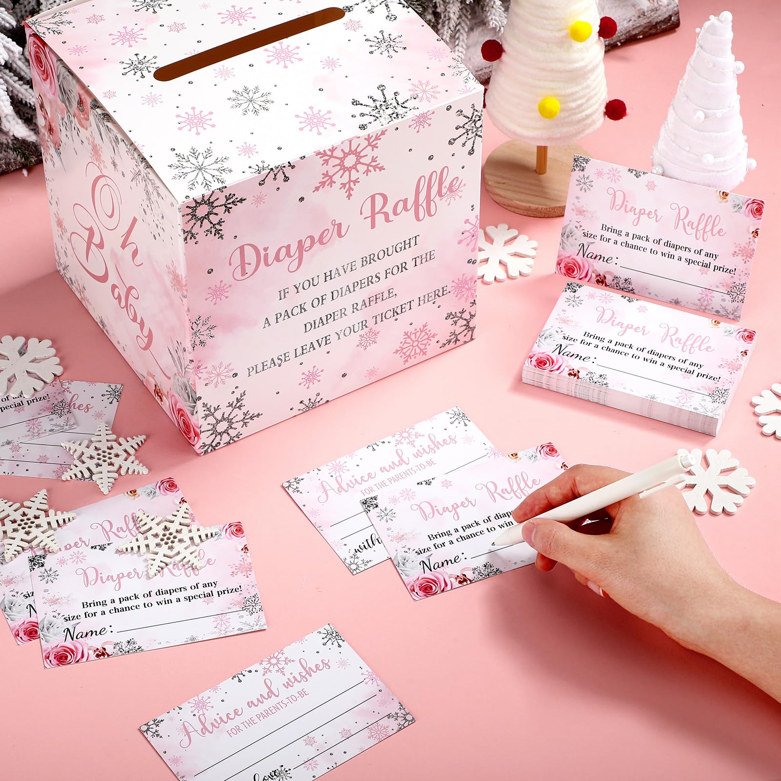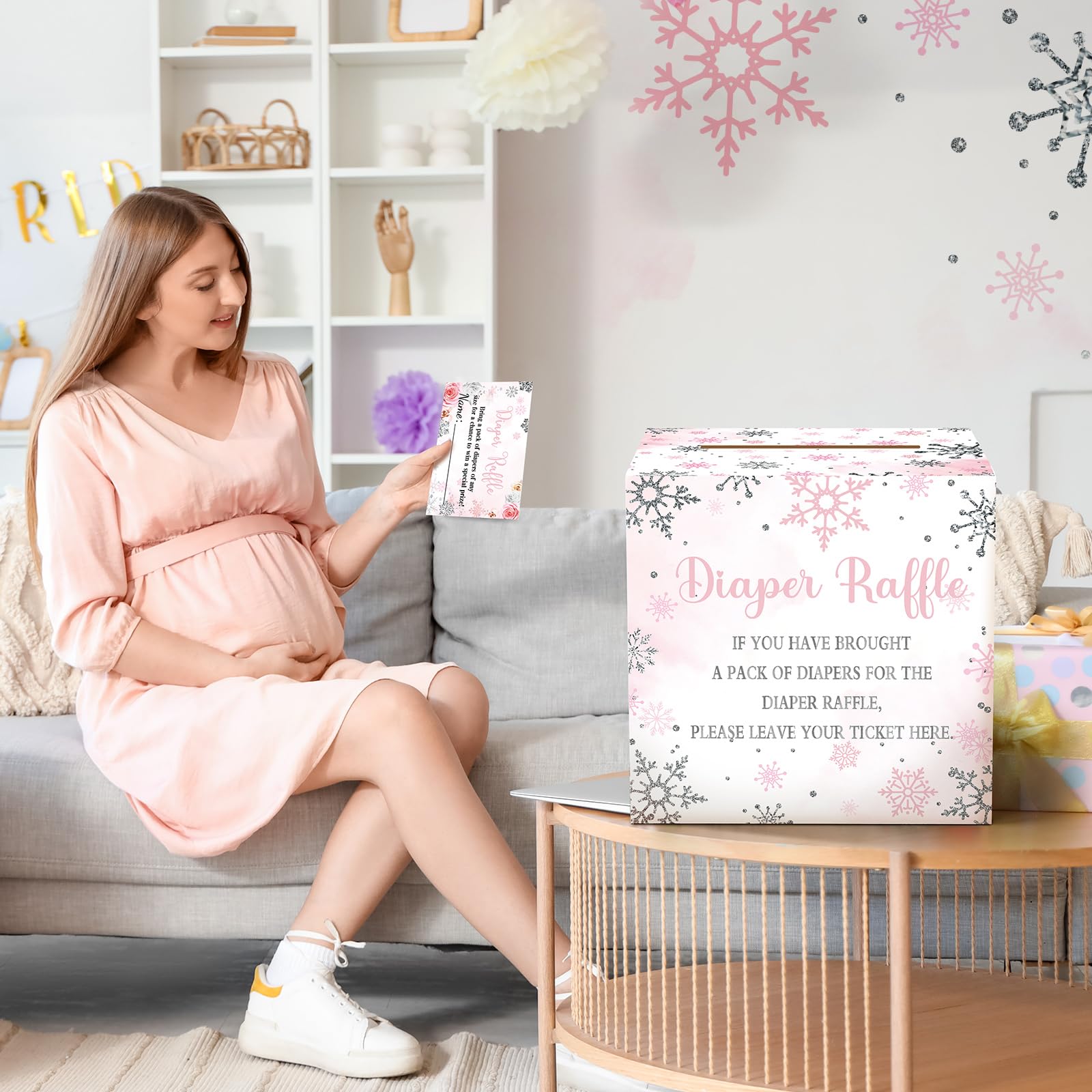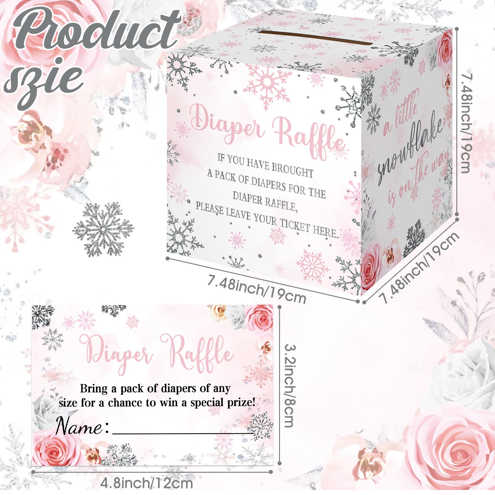 Snowflake Themed Design: the pink snowflake baby shower decorations are designed in the theme of snowflake diaper raffle, and printed with relative words and patterns, such as blue snowflake, pink rose and more, delicate and adorable, creating a warm and joyous atmosphere