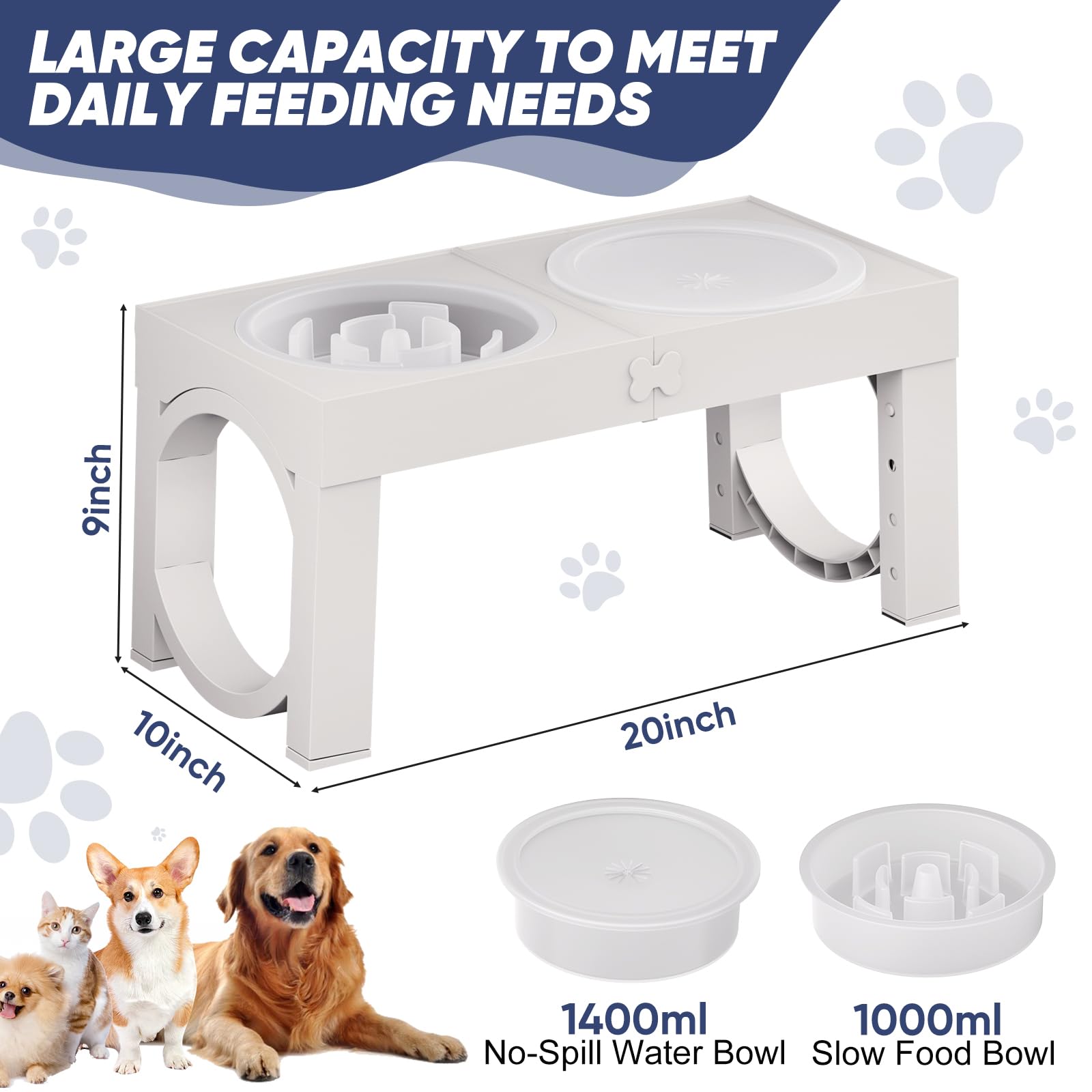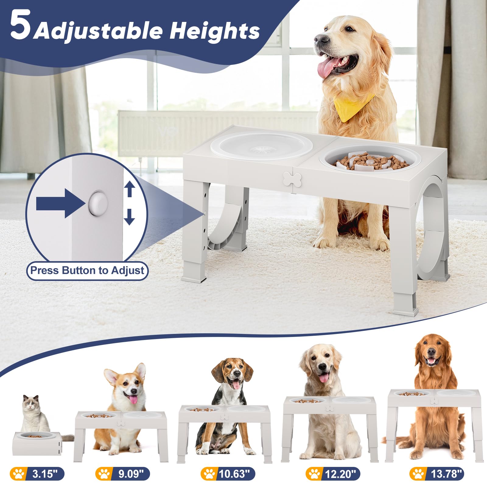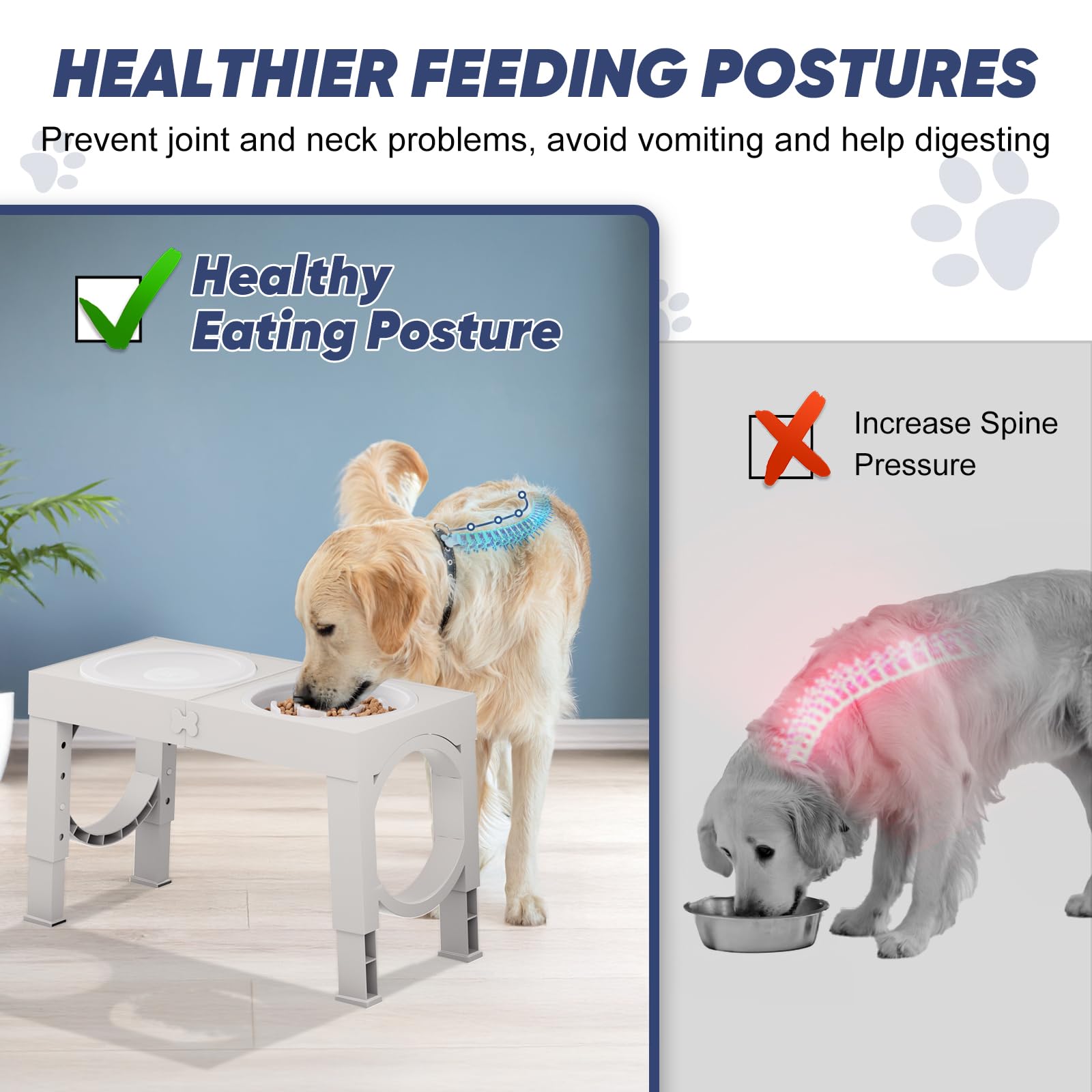 FOUR ADJUSTABLE HEIGHT RAISED DOG BOWLS: Our raised dog bowls for large sized dog can be adjusted to four different heights 3.15'' 9.09'' 10.63'' 12.20'' 13.78'', suit for all breeds and ages. Designed for large dogs, the maximum adjustable height is approximately 1.58 inch higher to fit large dogs needs.