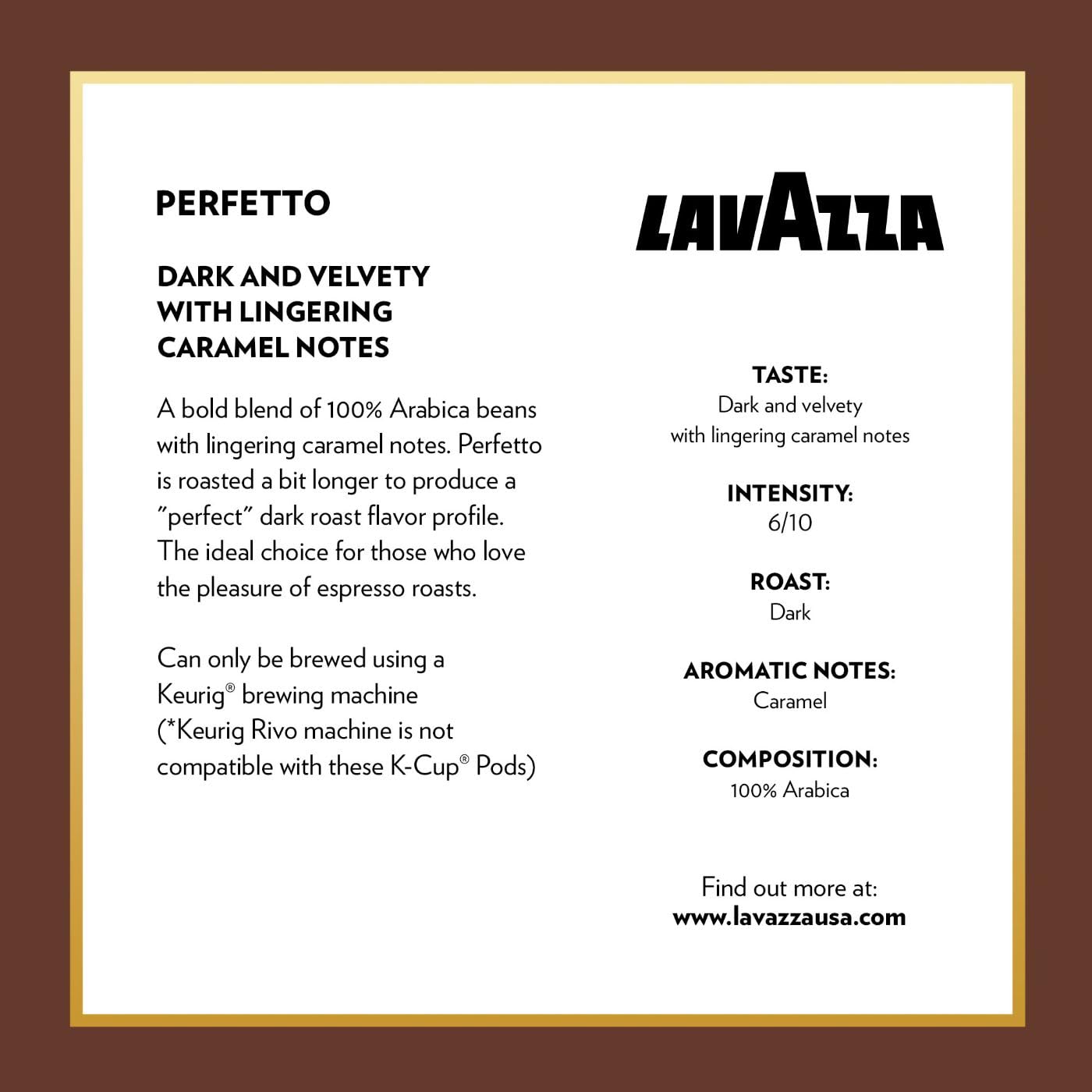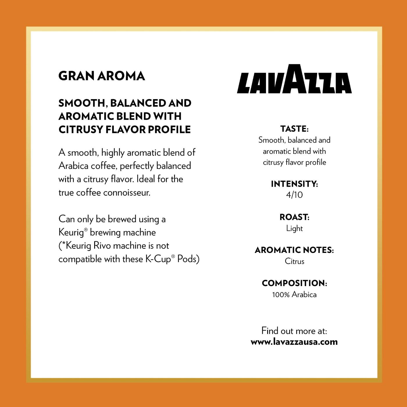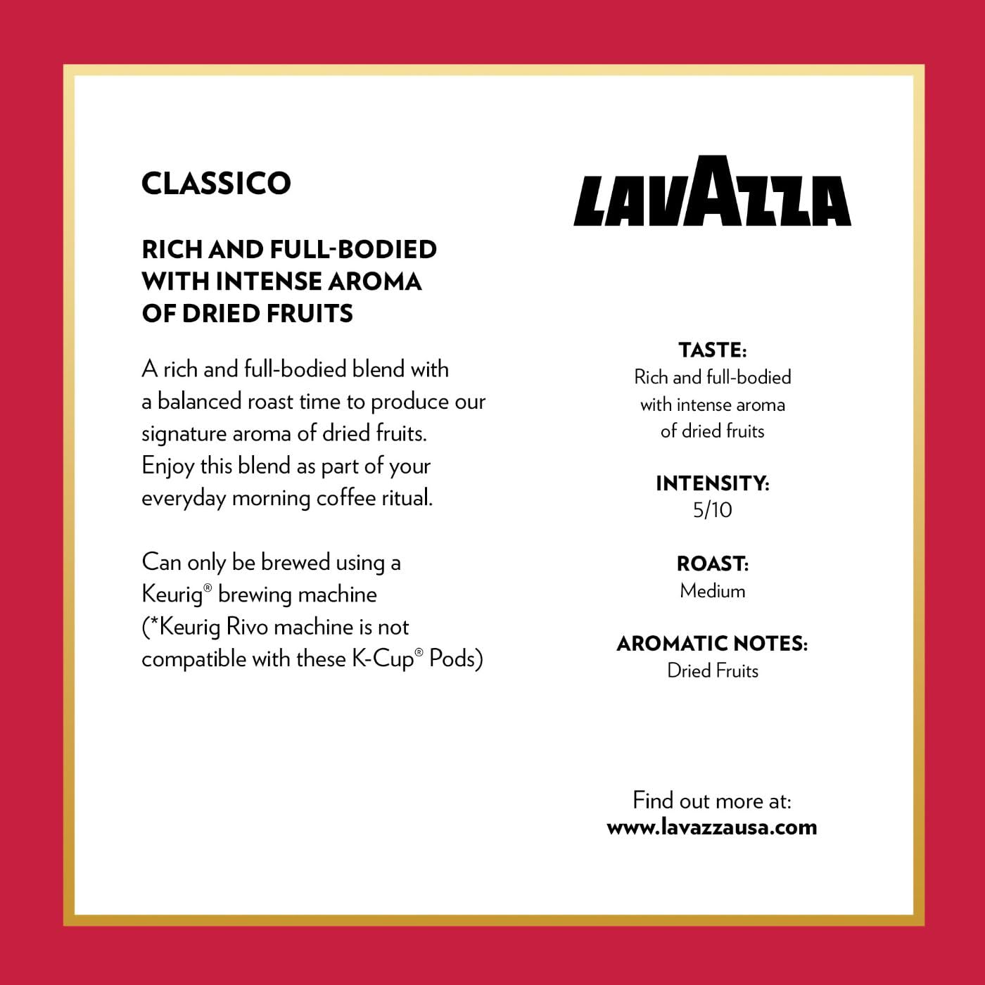 No matter how you take your coffee, Lavazza has a blend and preparation to perfectly fit into your coffee ritual. Four generations of the Lavazza family have dedicated over 125 years to sourcing the best blends of coffee beans from all over the world to bring you an unmistakable taste and aroma that is uniquely Lavazza. This Lavazza K-cup® Variety Pack includes: 16 K-cup® pods of Lavazza Classico medium roast coffee blend (hints of dried fruit), 16 K-cup® pods of Lavazza Gran Selezione dark roast coffee blend (hints of chocolate), 16 K-cup® pods of Lavazza Perfetto espresso roast coffee blend (hints of caramel), and 16 K-cup® pods of Lavazza Gran Aroma medium roast coffee blend (hints of citrus and chocolate). These blends allow for a variety of delightfully sippable cups of coffee using a Keurig® Brewer. Enjoy a premium experience where every small moment can be savored. Keurig and K-Cup are trademarks of Keurig Green Mountain, Inc., used with permission.