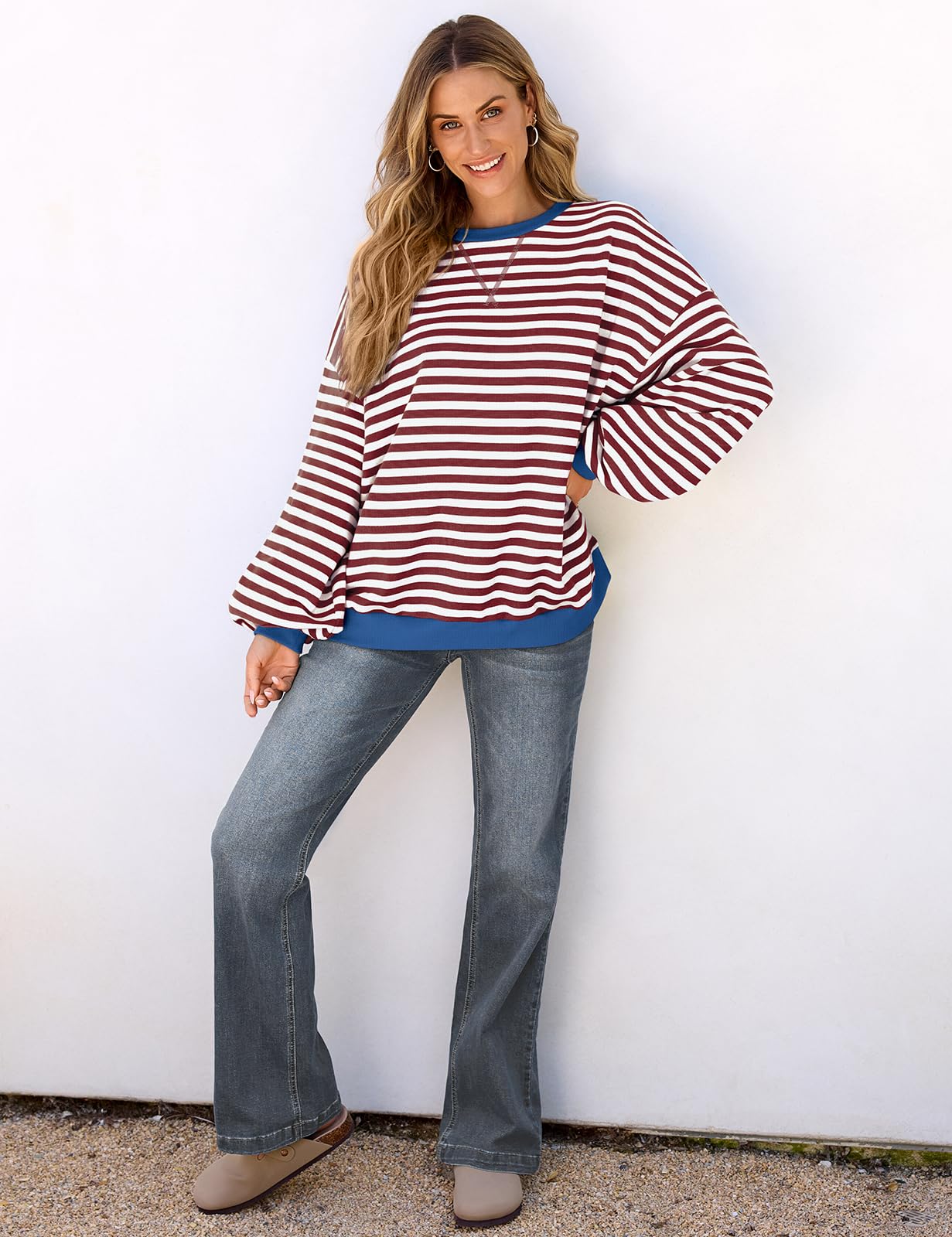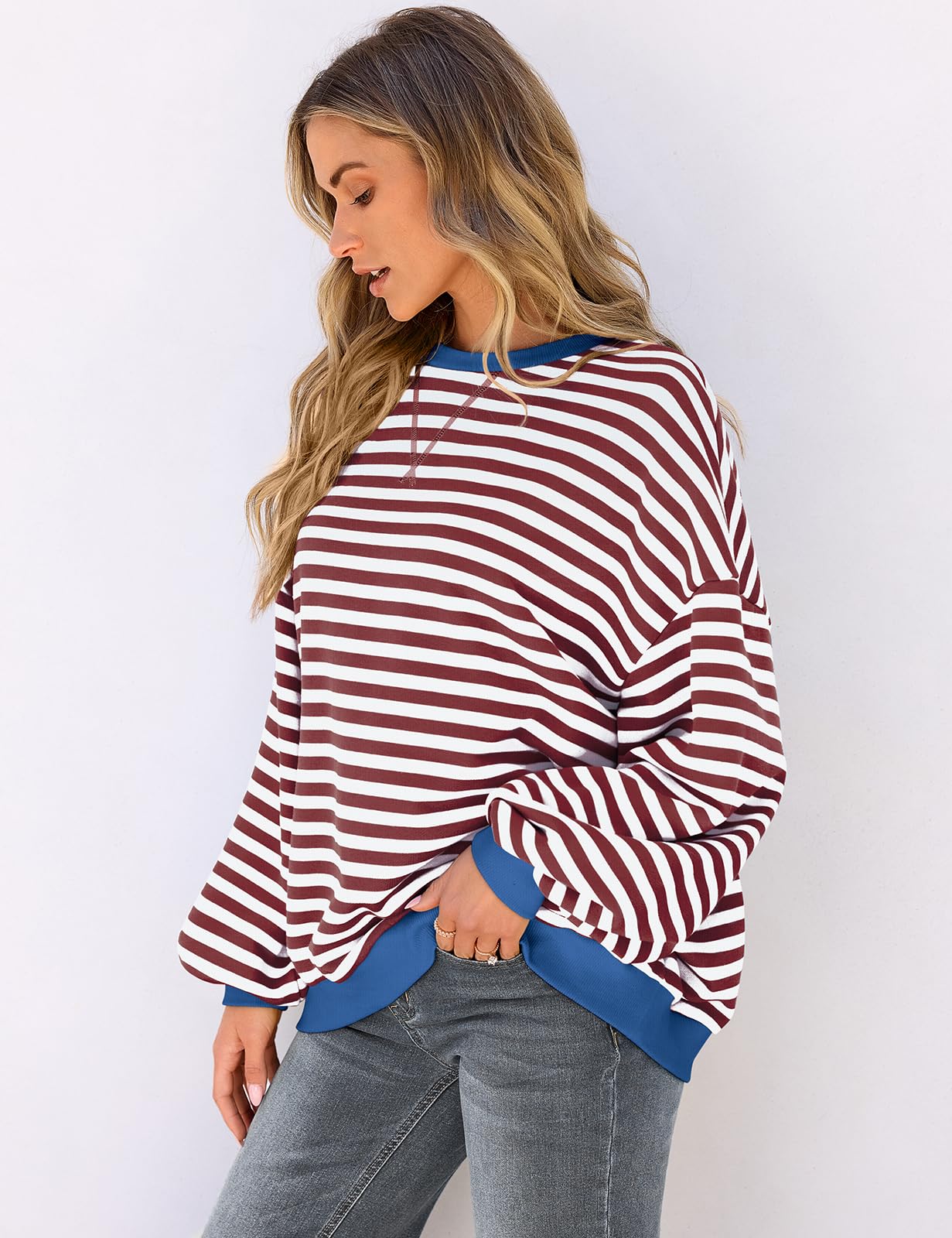 Matching Outfits: Oversized striped sweatshirt can be easily paired with various bottom options including shorts, skirts, jeans, leggings, and pants, along with sneakers and casual shoes. They also complement outerwear such as jackets, coats, vests, and cardigans.