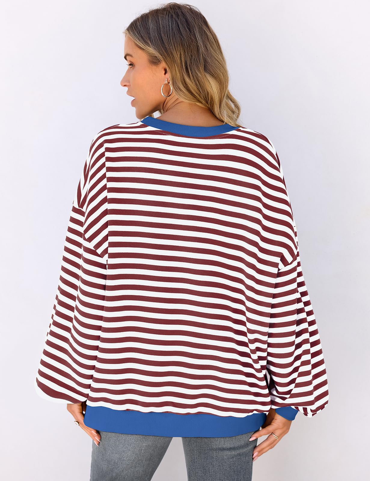 "Note the difference in the V-notch below the neckline of the two sweatshirts." The oversized cotton sweatshirt is soft, comfy, breathable, and skin-friendly, ensuring comfort throughout the day. The striped sweatshirts are cozy, lightweight yet warm, providing comfort throughout the year, suitable for all seasons