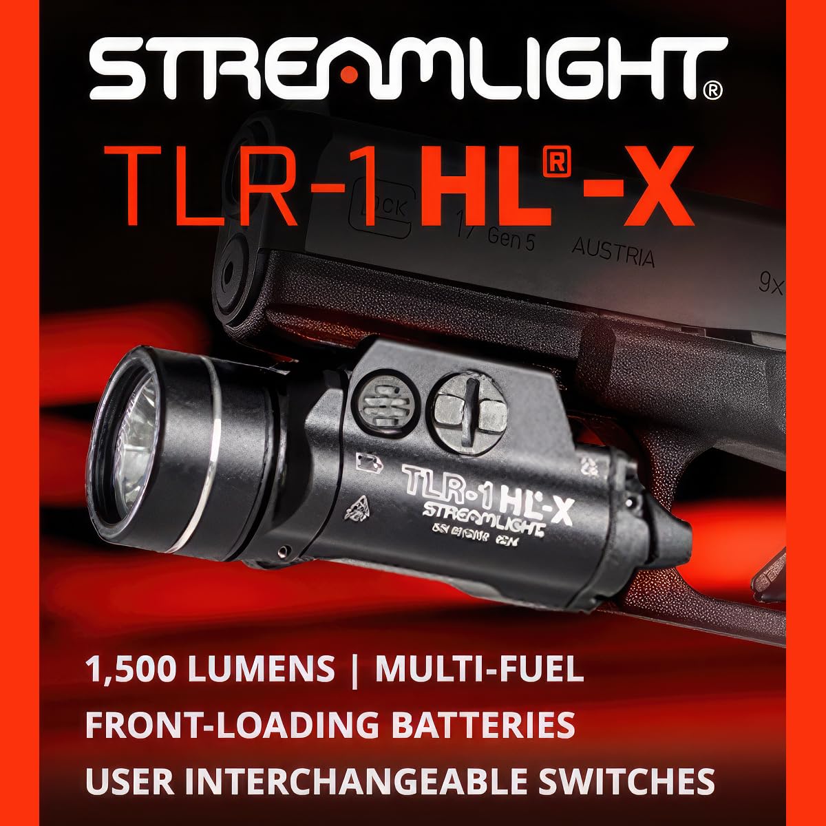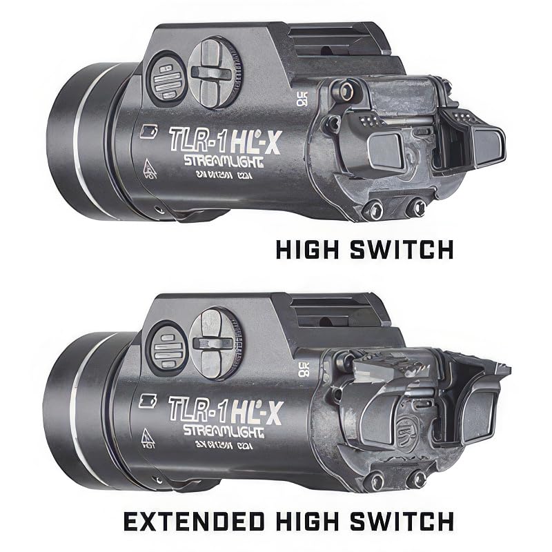 The multi-fuel Streamlight TLR-1 HL®-X features a hinged face cap with robust release controls that allow for front-loaded battery changes without removing the light from the firearm. The light provides 1,500 lumens and 20,000 candela when powered by (2) Streamlight SL-B9® proprietary rechargeable battery packs (included). The light can also operate with (2) CR123A batteries (sold separately) to deliver 1000 lumens and 15,000 candela. Customizable rear paddle switches, momentary and constant on operation and a programmable strobe mode offer additional versatility for many applications.