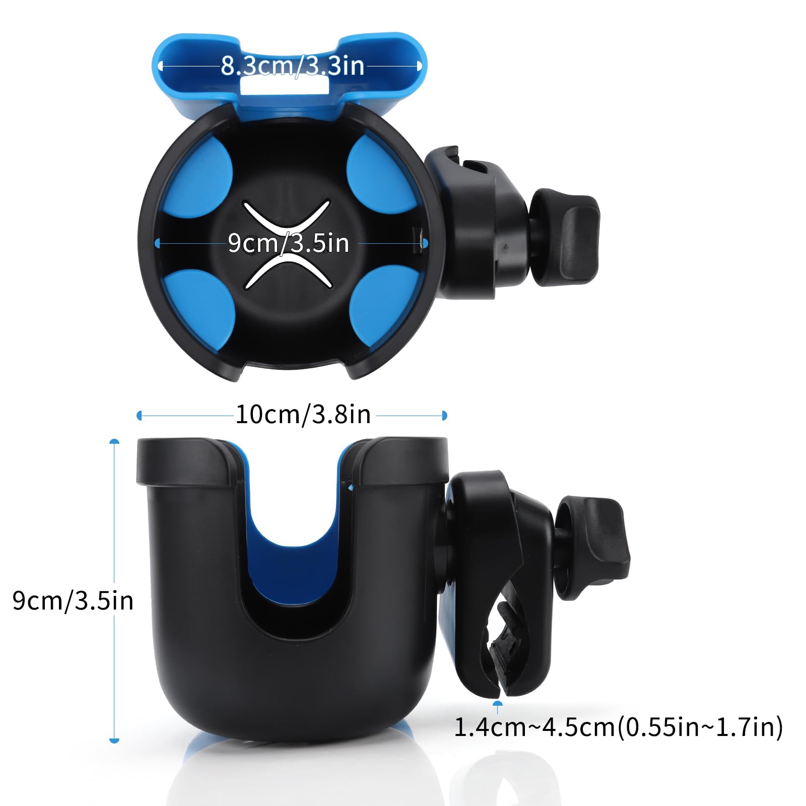 The clamp designed with rubber pad, it helps lock the cup holder onto the bar without movement. The clamp can also rotate 360 degrees, and it is adjustable to fit different size handle which diameter is 0.55-1.7 in / 1.4 cm- 4.5 cm.